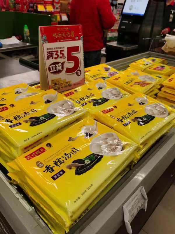 10:00,百佳超市君益店。超市负责人表示,今天的购物市民比往日多一些,同时线上订货也多了,线上订货以购买蔬菜、鲜肉和汤圆为主。今天店里的应节食品比平时多备了1倍,供应充足。由于蔬菜货源越来越充足,因此价格不但没有上涨,反而下降了,比如生菜之前每斤3.5元,现在2.5元。今天也因为过节准备了一些促销活动,思念、湾仔码头和利口福等冷冻食品买满35元减5元。