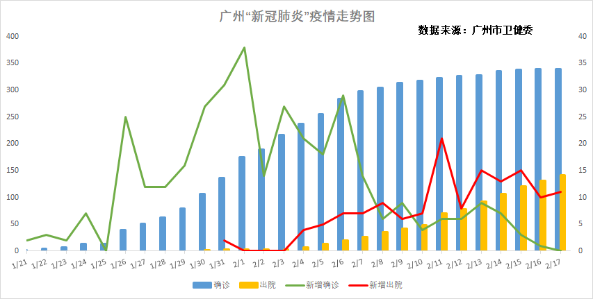 另一方面,广州新增确诊病例数量连日来呈现稳步下降趋势。从2月8日至2月16日,连续9天每日新增确诊病例数维持在个位数;从2月10日起,连续8天治愈出院人数超过新增确诊病例,更在2月17日首次出现新增确诊病例0例,疑似病例0例。