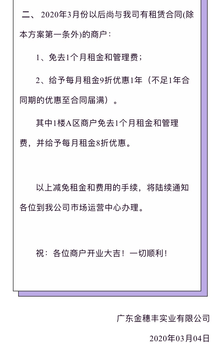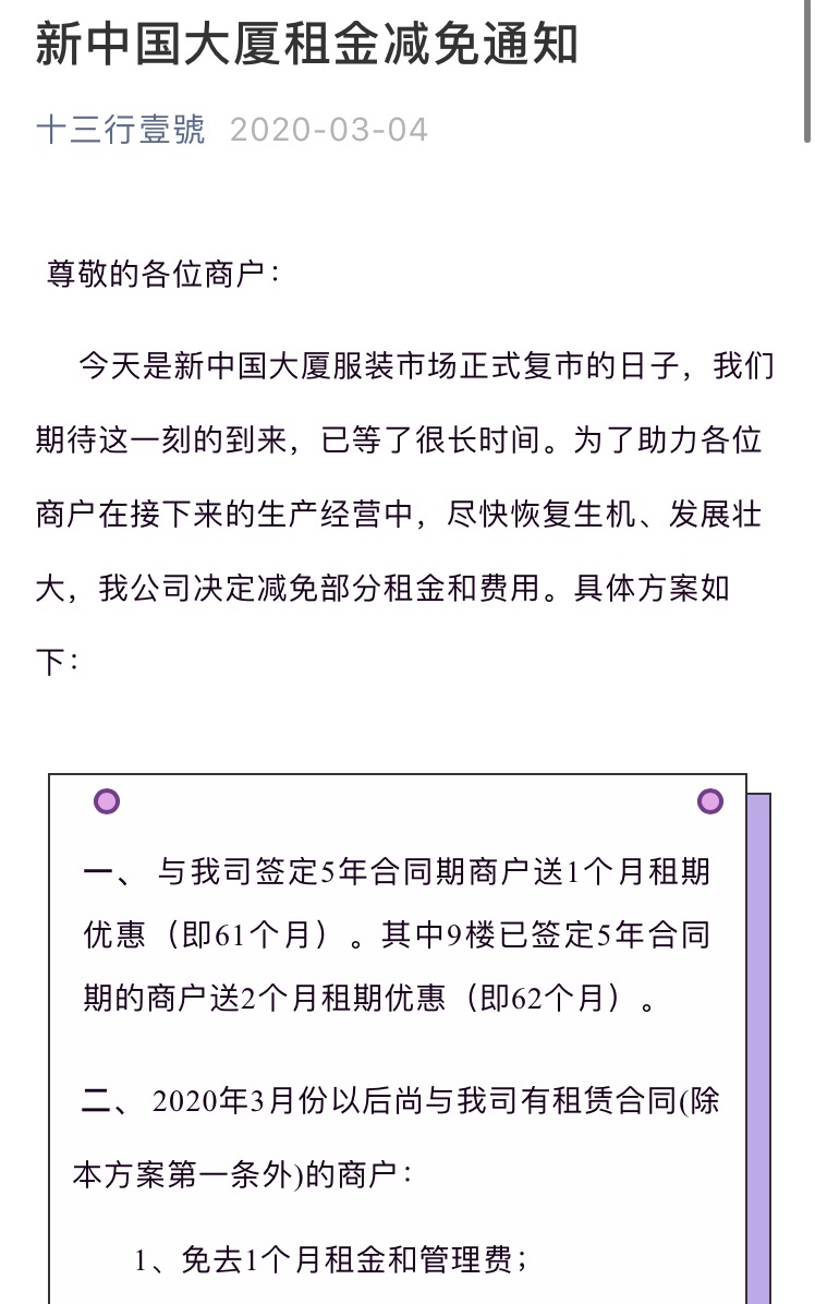 “新中国大厦里面有四个运营主体,我们是其中一个。大概有2000多个档口,整个新中国大厦大约有3000多个档口”。他介绍,3月4日,公司已在微信公众号“十三行壹號”发布了《新中国大厦租金减免通知》,提出与公司签订5年合同期的商户送1个月租期优惠(即61个月),其中9楼已签订5年合同期的商户送2个月租期优惠(即62个月)。除签订5年期合同商户外,对于2020年3月份以后仍有租赁合同的商户,将免去1个月租金和管理费,并给予每月租金9折优惠1年(不足1年合同期的优惠至合同届满)。1楼A区商户还将免去1个月租金和管理费,并给予每月租金8折优惠。