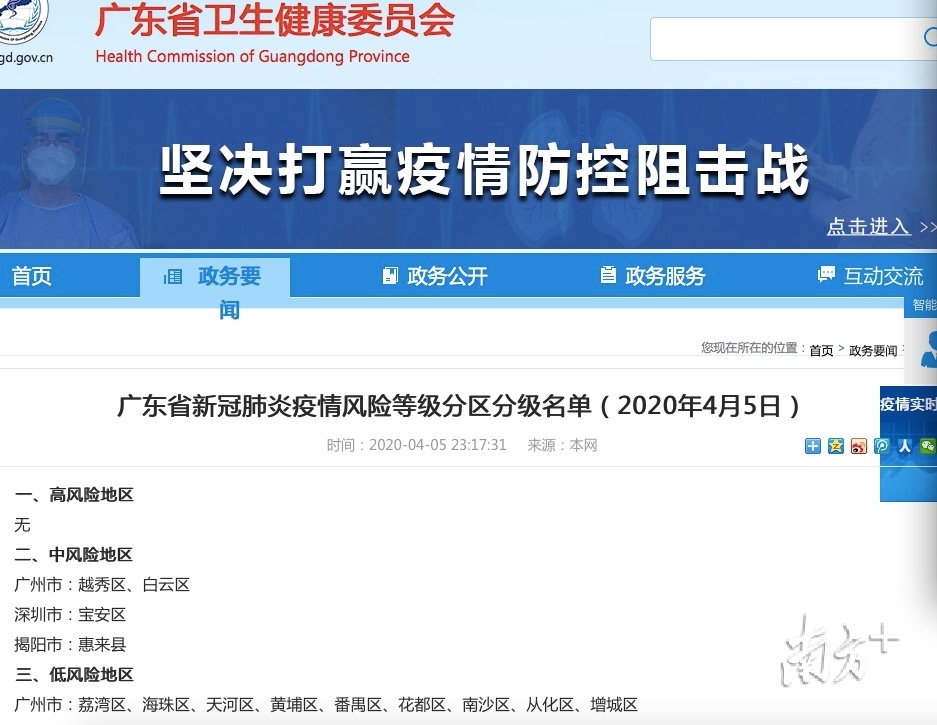 4月5日,广东省卫健委发布《广东省新冠肺炎疫情风险等级分区分级名单》,其中广州市越秀区、白云区为中风险地区,荔湾区、海珠区、天河区、黄埔区、番禺区、花都区、南沙区、从化区、增城区为低风险地区。
