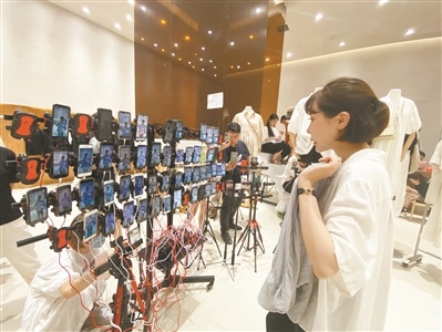 在广州火车站附近的某服装批发市场,老板娘爱皙绝对是鼎鼎大名,大家都管她叫“爱姐”,而她则逢人便说:“叫我小爱就可以了。”一进入爱皙的服装档口,只听人声鼎沸,到处都是拿着手机做直播的男男女女,而且各个年龄段的主播都有。爱皙说,现在服装店的主播已有七八十个,“很多人都是慕名而来的”。