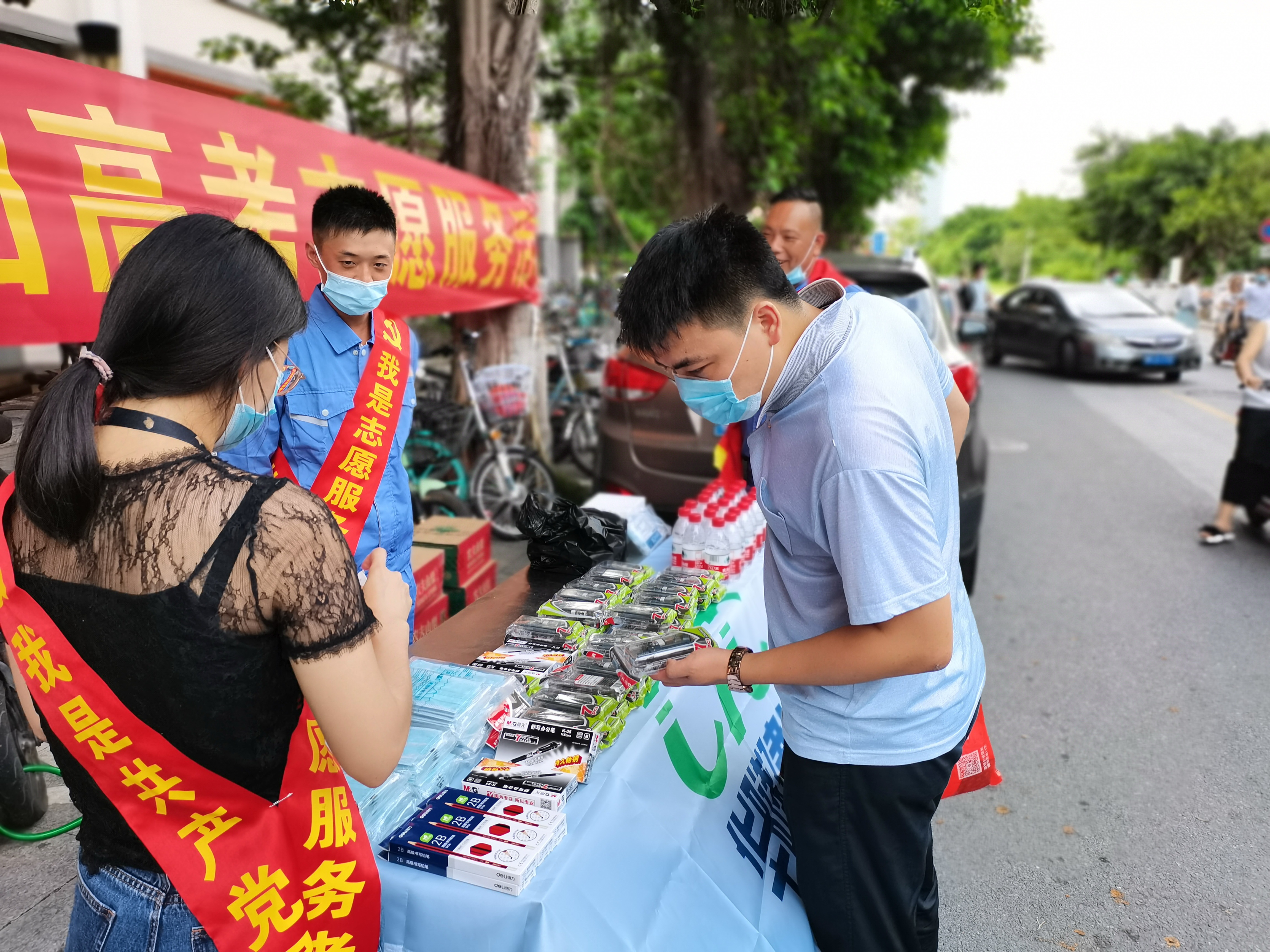 7月7日,记者在广州市第一一三中学(东方校区)的门口看到,来自中铁三局广州地铁十一号线三分部的志愿者们一早就到校门口的“志愿服务站”上岗。“志愿服务站”里除了配备充足的口罩、消毒水等卫生防疫物资,还细心地准备了遮阳伞、防暑降温药品、应急文具、矿泉水等防暑、防“大头虾”用品,随时为有需要的考生和家长送上便利。此外,志愿者们还与附近执勤的交警、城管等建立了联动机制,为考生提供应急服务。7月7日上午,一名考生家长向志愿者反映,有考生正从附近地铁站步行前来考场,此时距离禁止入场时间仅有7分钟,担心错过入场时间。志愿者立即联系现场执勤交警,安排“铁骑”前去地铁站接送该名考生,最终该名考生在规定时间内进入考场。