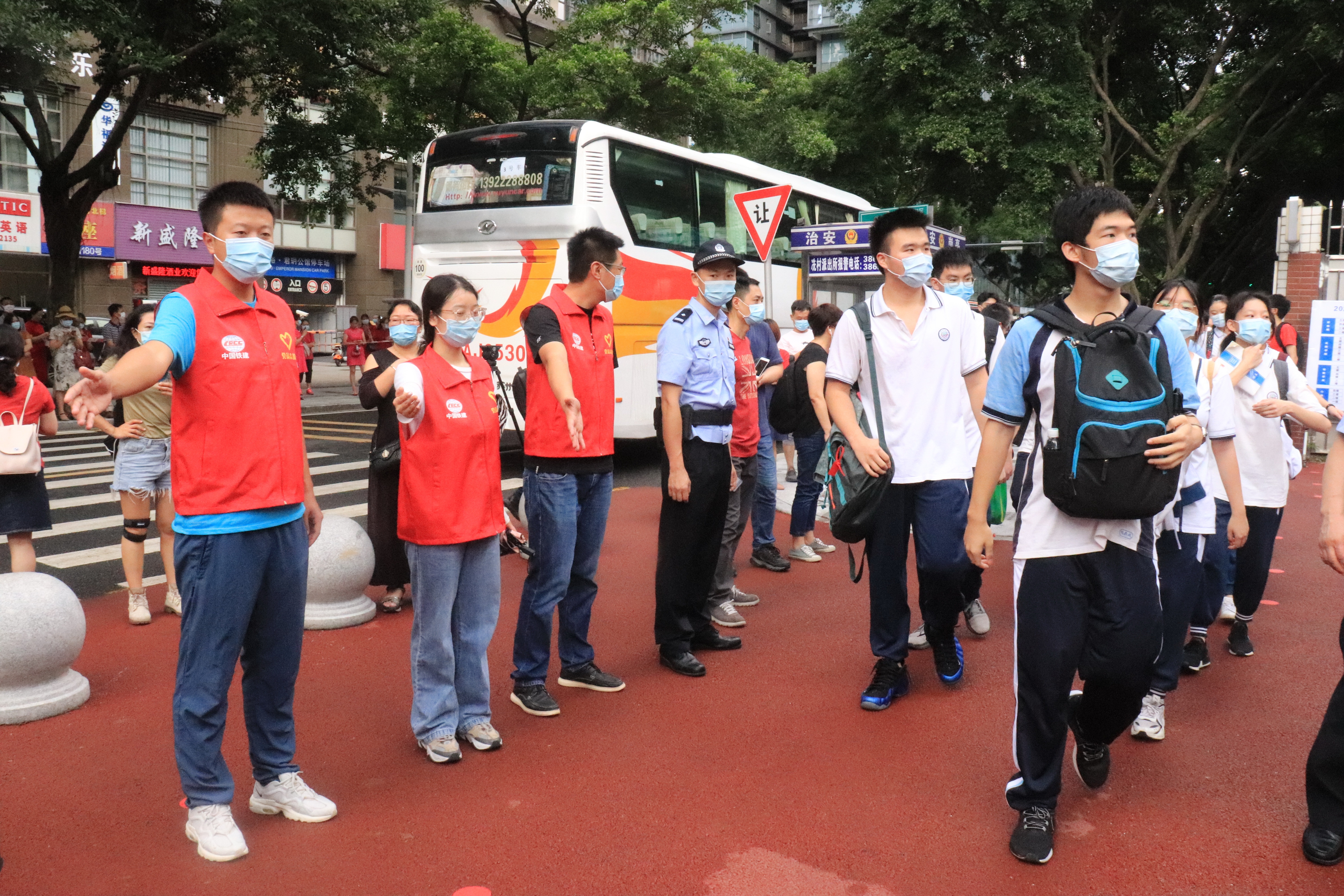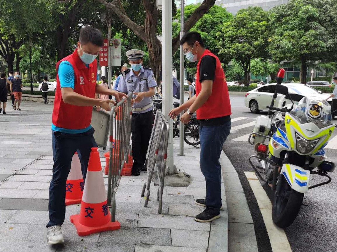 与此同时,中铁十六局广州地铁十号线一项目部的志愿者们在广州天河中学考点附近当起了“交通协管员”,配合执勤交警指引途经车辆快速通行,确保考生顺利进入考场。“项目自2019年11月份进场以来,就一直在推动与周边学校、社区的联动共建。这次我们的青年到学校周边开展高考志愿服务活动,就是要用实际行动践行‘地铁建设为人民’的理念。”中铁十六局广州地铁十号线一项目部党支部书记杨成说道。而在广州市华侨中学(金沙洲校区)、广州市白云中学(南区)考点,来自广东华隧广州地铁十二号线一项目部、中铁一局广州地铁八号线北延段供电项目部的志愿者们也专门安排了应急车辆,为师生、家长紧急情况下提供接送服务。
