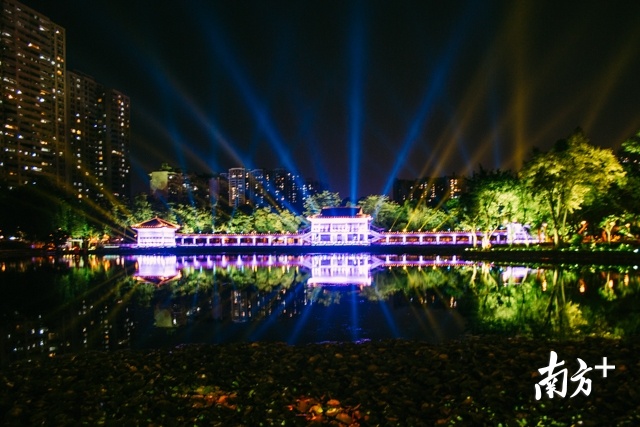 文塔广场则以河涌沿岸灯光为主打,增加建筑物与景观灯光,以水墨投影秀为内容亮化文塔建筑立面,融入岭南传统文化元素,演绎古今流转。