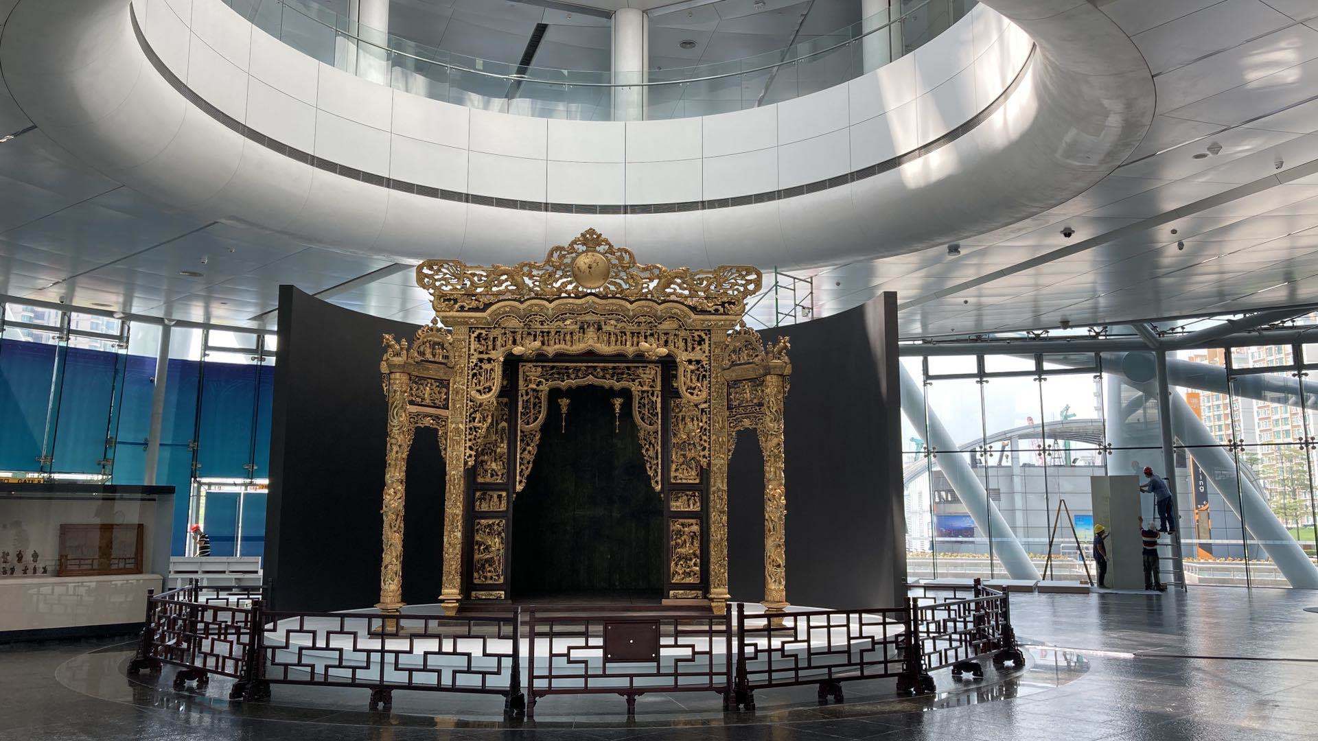 参观完一楼的展品,沿着电梯走上广州塔二层,体量巨大、气势恢宏的金漆木雕神龛扑入眼帘,一侧的展示柜里陈列着广绣、广彩、通草画展品。作为“岭南之窗”广州文旅融合创新示范区项目的一部分,岭南文化主题展览占据了广州塔一至二层空间,展示具有岭南特色、已列入国家级非物质文化遗产保护名录的传统民间工艺。