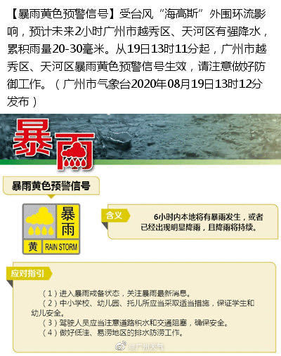据@广州天气,受台风“海高斯”外围环流影响,预计未来2小时广州市越秀区、天河区有强降水,累积雨量20-30毫米。从19日13时11分起,广州市越秀区、天河区暴雨黄色预警信号生效,请注意做好防御工作。