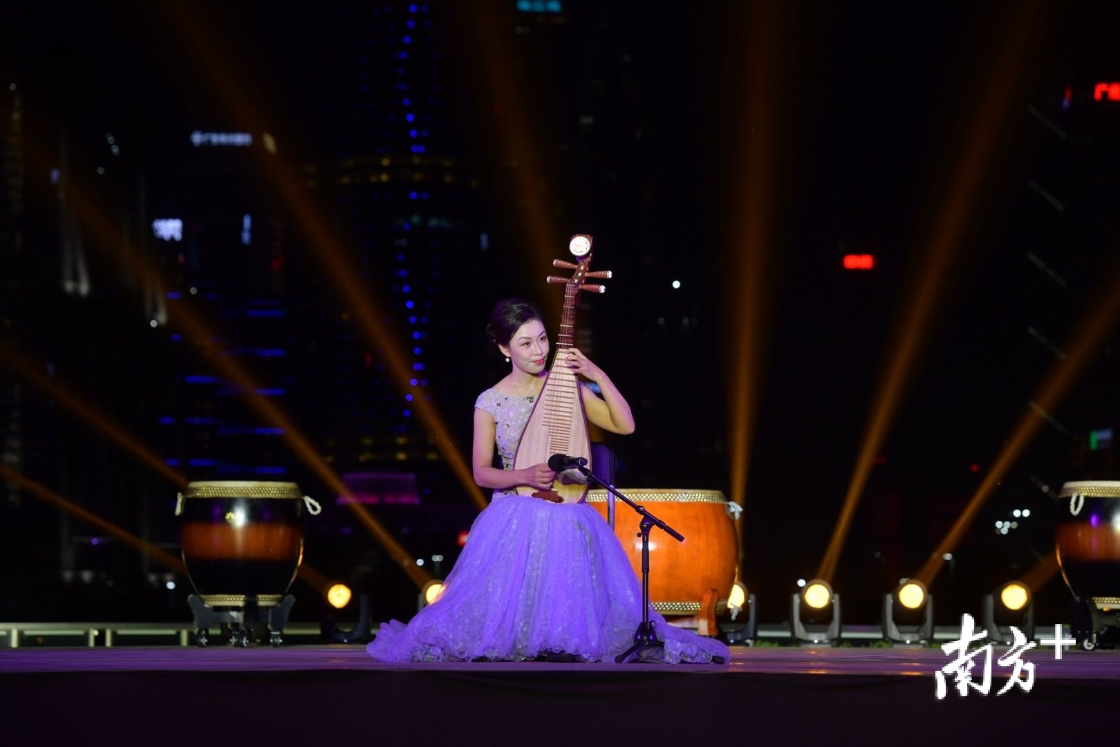 音乐会的压轴曲目,是一首气势宏大、层次丰富的粤曲琵琶弹唱《领航未来》。如梦如幻的舞台上,身穿华服的琵琶丽人陈玲玉歌声嘹亮穿透,琵琶弹拨如珍珠落盘般悦耳动听,呈现出一幅南下创业年轻人为强大祖国和璀璨未来奋发图强的壮美画面。