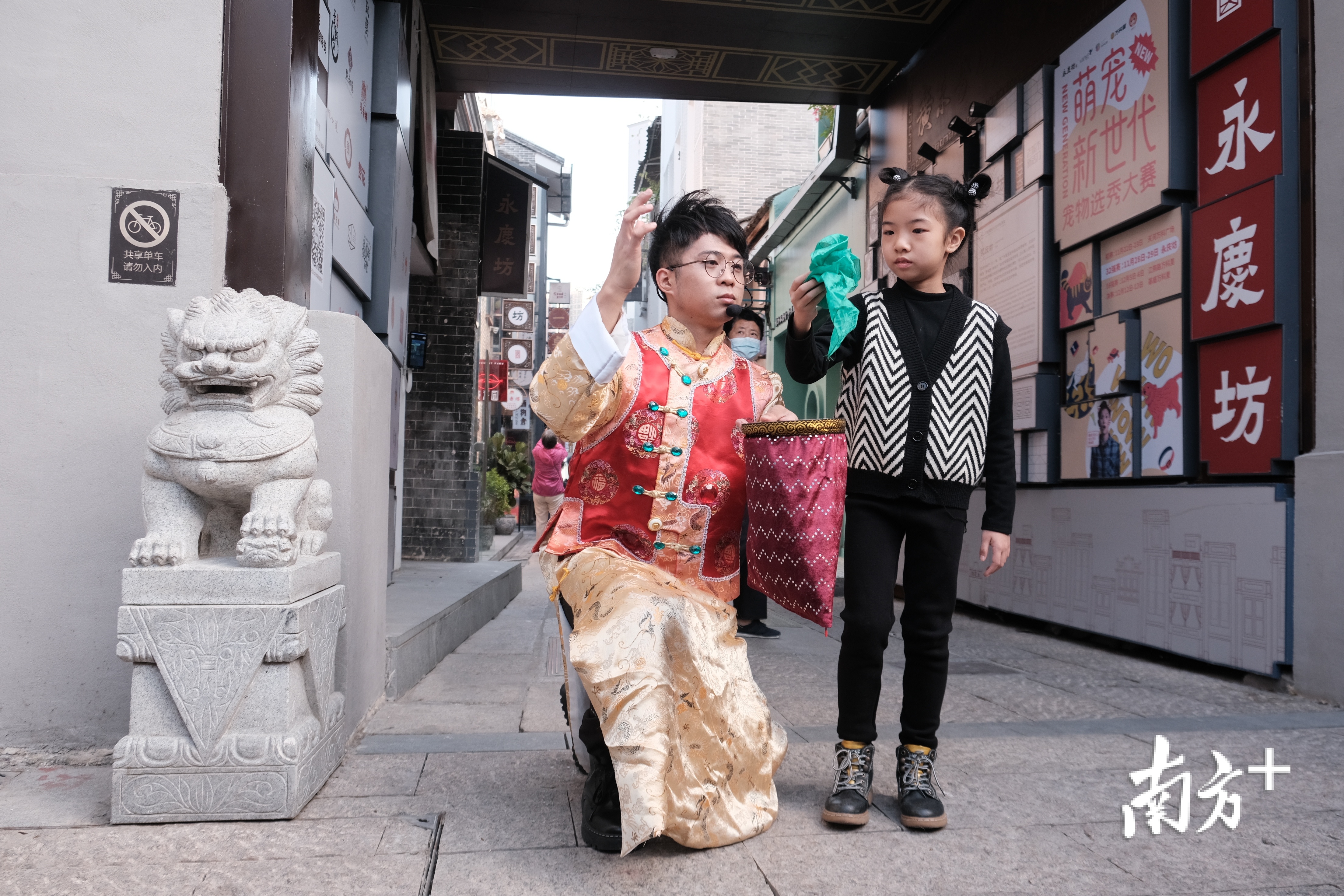 吴财记的炸云吞、皇上皇的腊肠、莲香楼的花生酥、赵家狮的小狮头……帅气的街头魔术师将地道的西关传统美食、精巧的岭南传统工艺品化身“道具”,通过神奇的“魔法”送到游客手中,让游客把西关“带回家”。令人惊艳的近景魔术,让街坊游客们大赞神奇。
