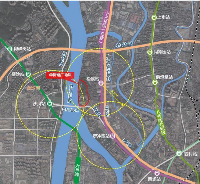 华侨糖厂地块原属国有旧厂,宗地所在广州西岸(罗冲围)更新改造片区,位于白云区西部,珠江西航道东侧,临近北环高速公路、广清高速连接线和内环路等城市干道,距离地铁十三号线松溪站(在建)约300米,地理位置优越。