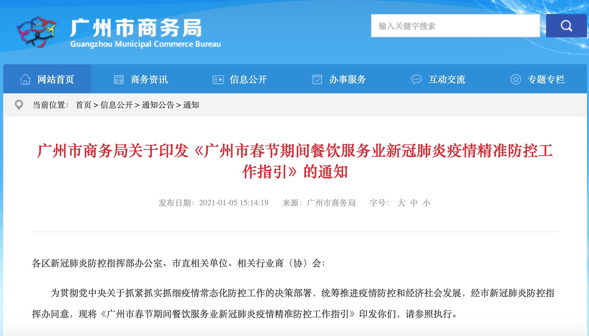 1月5日,广州市商务局在其官网发布《广州市春节期间餐饮服务业新冠肺炎疫情精准防控工作指引》(下称《指引》)。该指引适用于春节假期期间,广州市范围内餐饮服务单位的疫情防控工作。