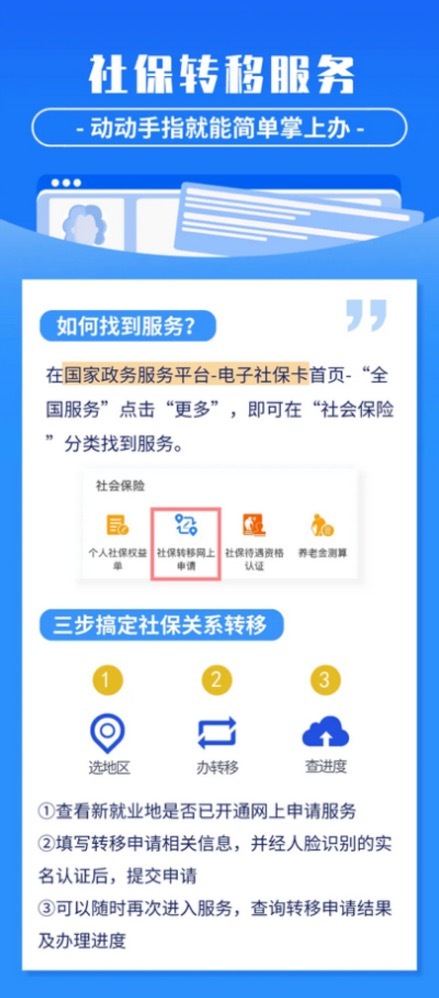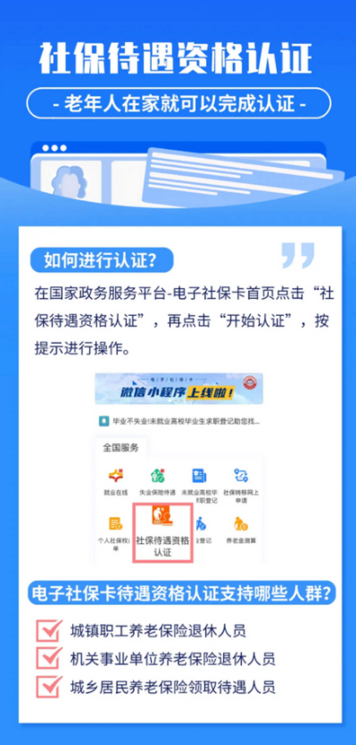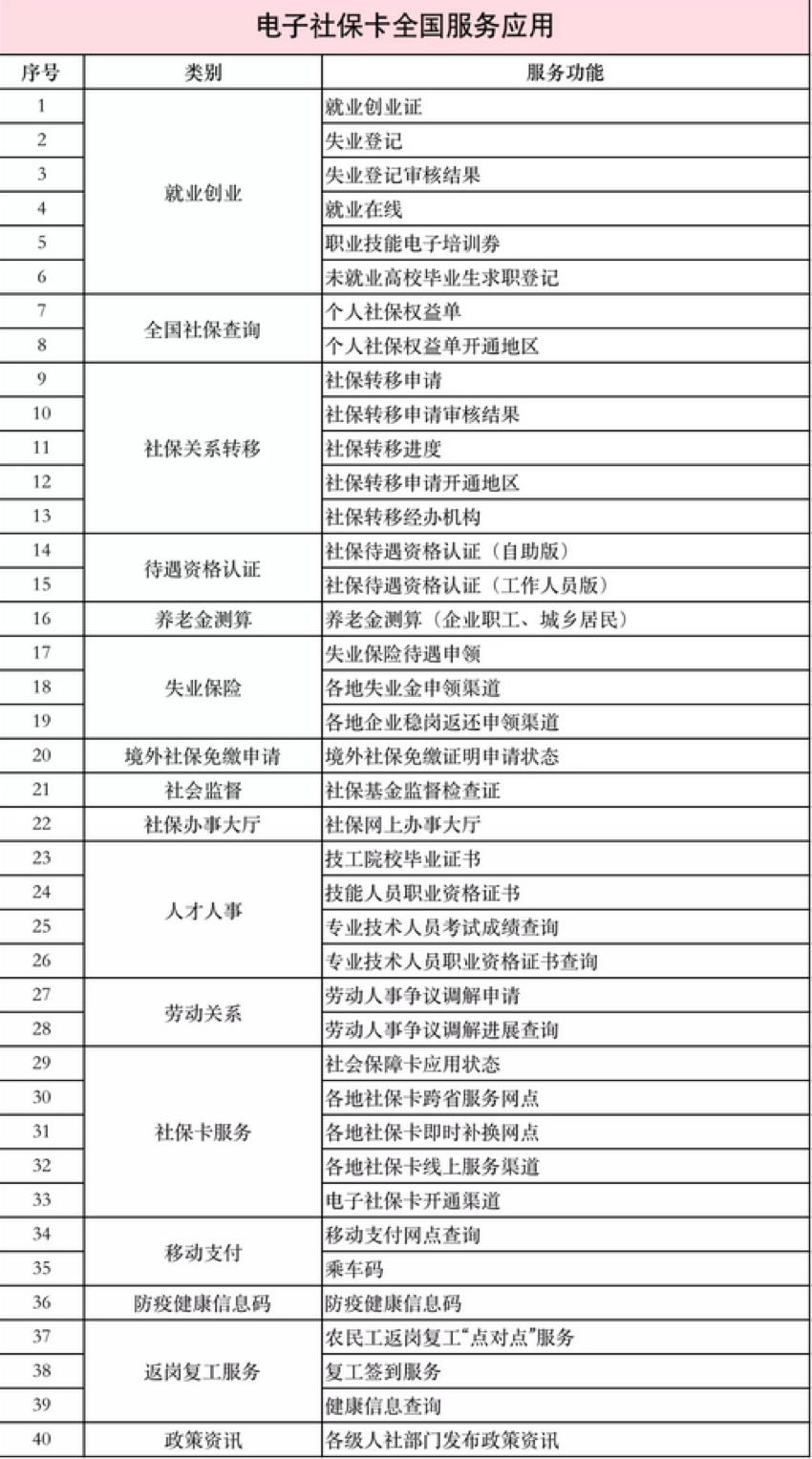 另外,电子社保卡还提供了养老保险待遇资格认证办理、失业金申领、职业资格证书查询、社保关系转移办理以及我的社保卡等更多的全国服务。