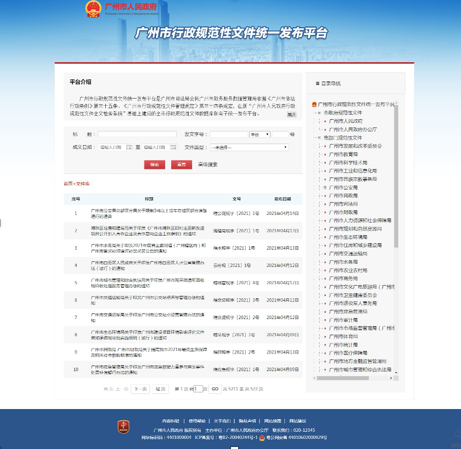 目前,该平台成为门户网站关注度最高的板块之一。2020年共535件规范性文件通过“广州市行政规范性文件统一发布平台”向社会公开。作为全市规范性文件的“图书馆”,公众通过广州市政府门户网站进入平台后只需输入简单的关键词,辅以成文日期、文件类型等筛选条件,即可迅速检索到相应文件。