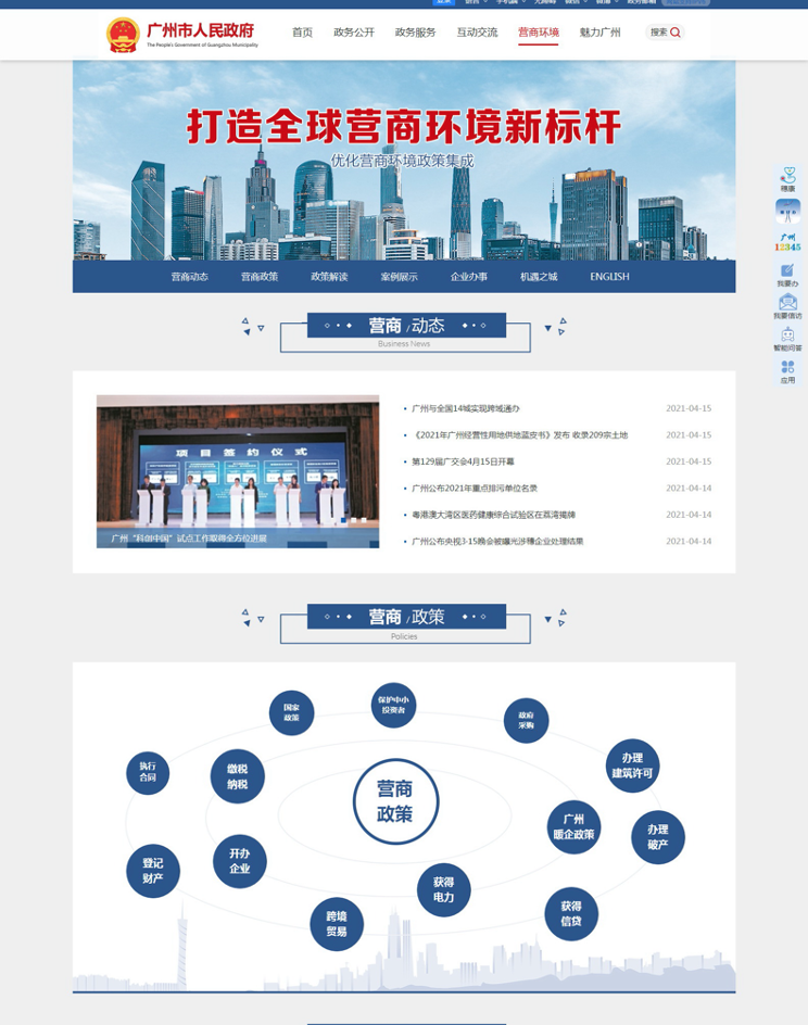 2019年11月,广州市政府门户网站对标世界银行评估标准,对照国内外最佳实践,打造了以企业全生命周期为主线的“优化营商环境政策集成”专窗,并开通了英文版。