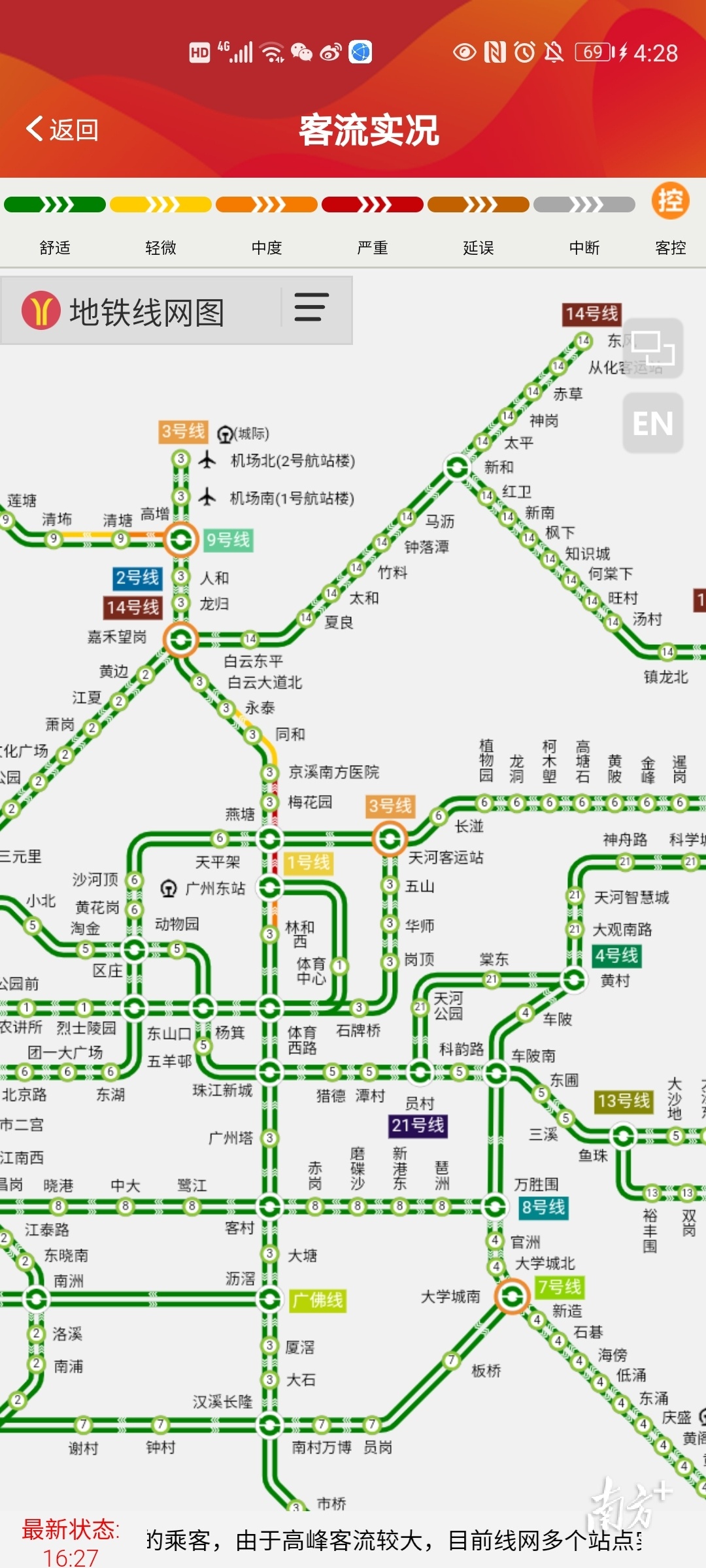 今天16时26分,广州地铁APP显示,根据实时客流监测数据,线网的进站客流持续增加,预计晚高峰时段线网客流会比较大,广州地铁已启动大客流预警响应,体育西路站、珠江新城站、昌岗站、万胜围站、杨箕站、公园前站、客村站、广州火车站等站点将采取客流控制,线网其他站点将视情况采取客流控制。届时请乘客们留意车站告示及广播并配合工作人员的指引有序乘车。