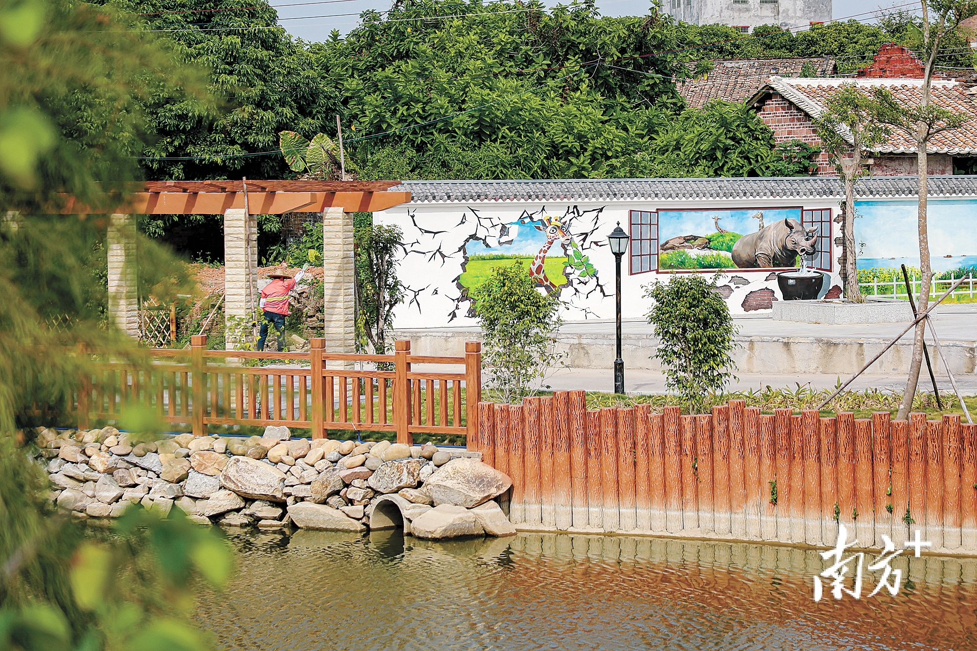 钟落潭镇黎家塘村,是另一处别有洞天的世外桃源。村里的一片风水塘风景如画,一条栈道从中间蜿蜒而过,一座凉亭建在水中央,村民正在悠哉地休憩。