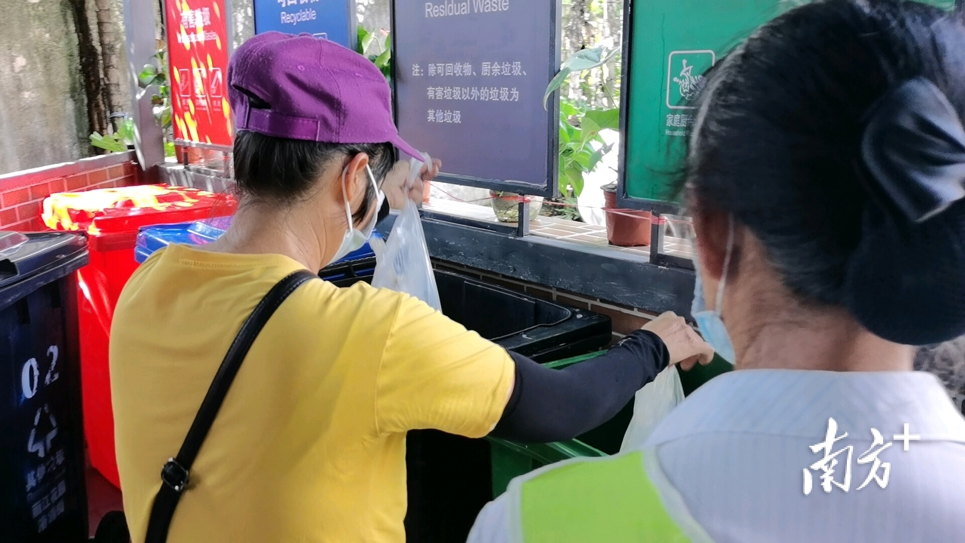 在记者采访时,有一位居民走入投放点把一袋米饭直接扔进了“其他垃圾”桶里,负责站桶的保洁员马上从桶里把这袋厨余垃圾分拣出来,随后破袋投放到“厨余垃圾”桶内。“对于个别不自觉的人,我们每次都口头提醒教育。”这位保洁员表示。
