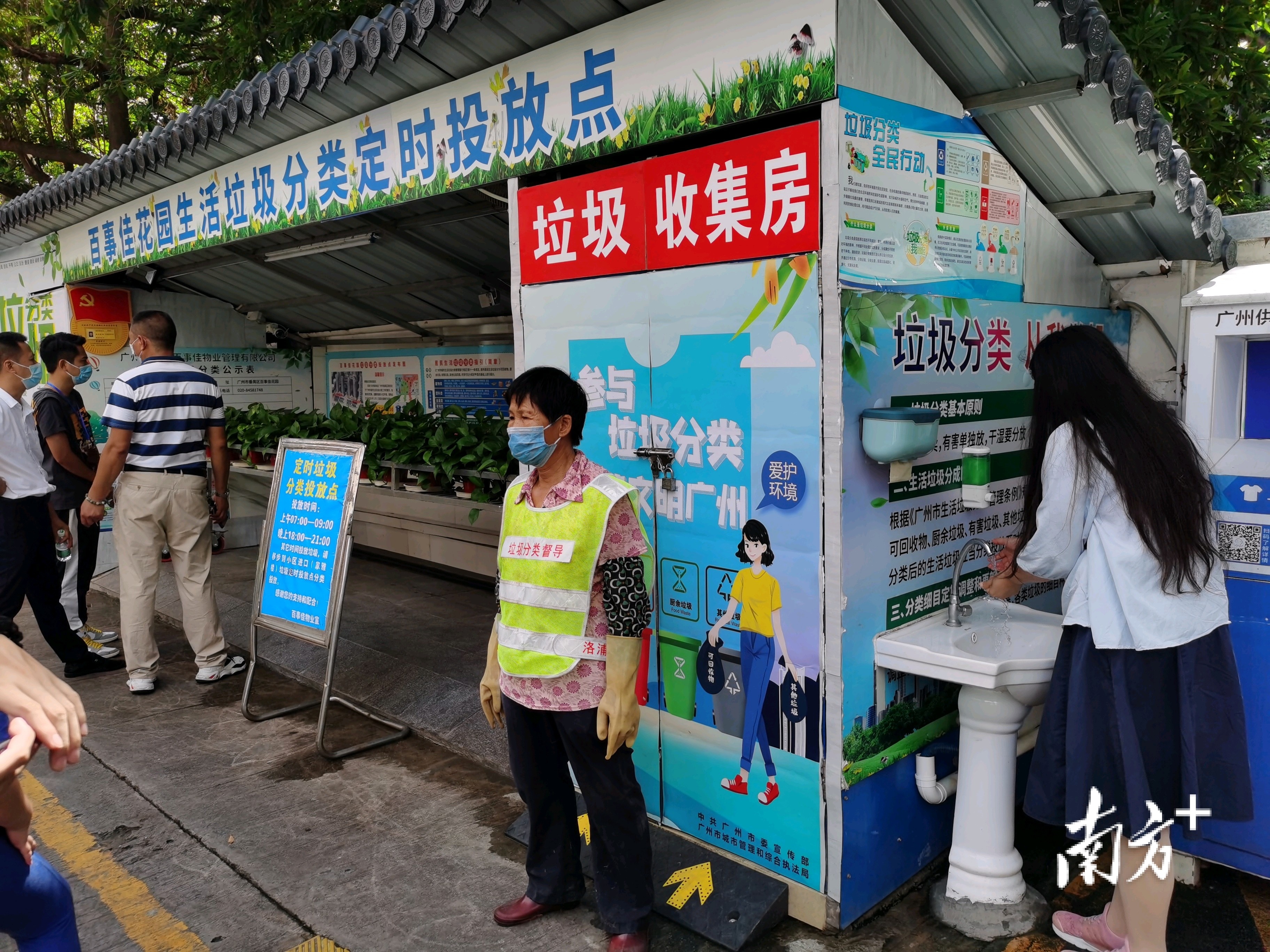 随后,记者随执法队来到了百事佳花园。此前,这里的投放点建设标准较低,洗手台缺失,地面泥泞,居民的投放体验比较糟糕。针对群众反映的问题,广州市城市管理和综合执法局责令百事佳花园进行整改。如今,该小区的生活垃圾投放点已全面规范配置了纸巾、洗手液和洗手台。同时,投放点还铺上了崭新的地砖,并有保洁员定时对地面进行清洁。