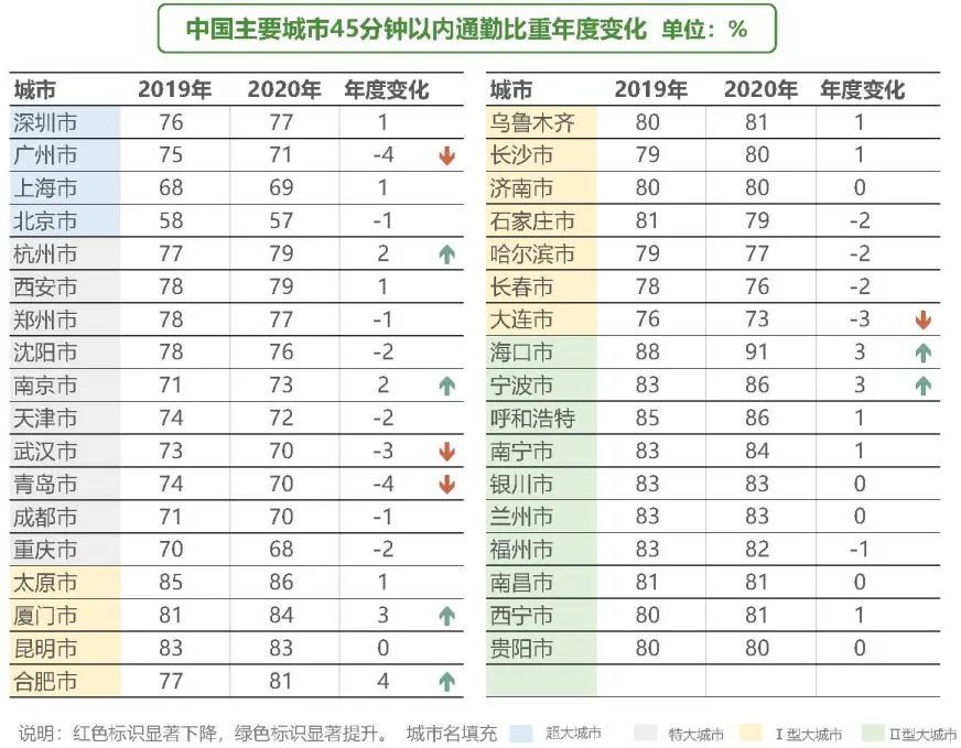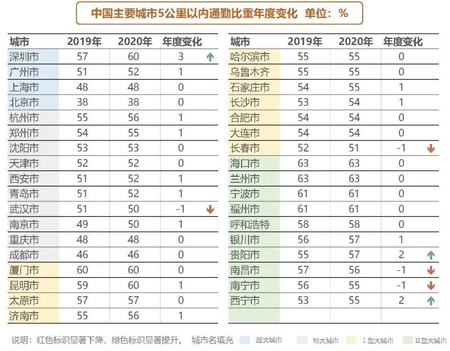 通勤距离在5公里以内被视为幸福通勤,5公里以内通勤比重越高说明城市能够就近职住、绿色出行。
