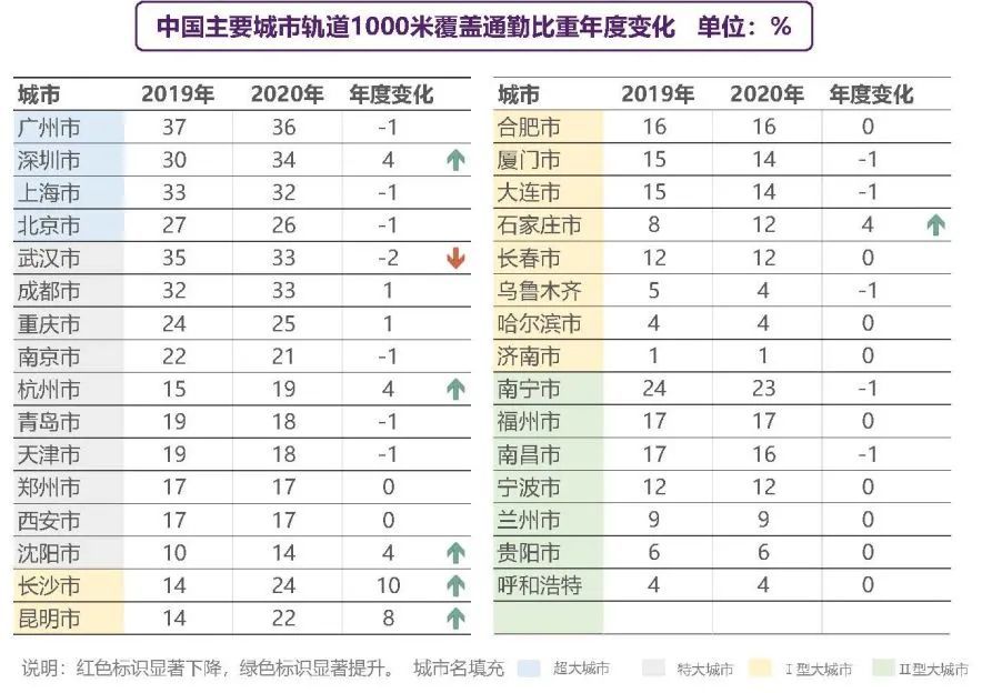 而轨道覆盖通勤比重强调线路走向与通勤需求相契合,体现轨道交通布局与职住空间的匹配度。