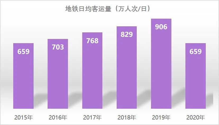 年报显示,近五年广州地铁通车里程增长1倍,实现“区区通地铁”。运营线路从2015年的9条、266公里增长至2020年的16条、531公里,站点从139座增加至238座,将轨道交通服务延伸至外围区,实现了外围区与中心城区的快速联系。2019年日均客运量906万人次,增幅37.5%,全网轨道客流强度1.90万人次/公里。2020年受疫情影响,日均客运量降至659万人次,客流强度降至1.24万人次/公里。