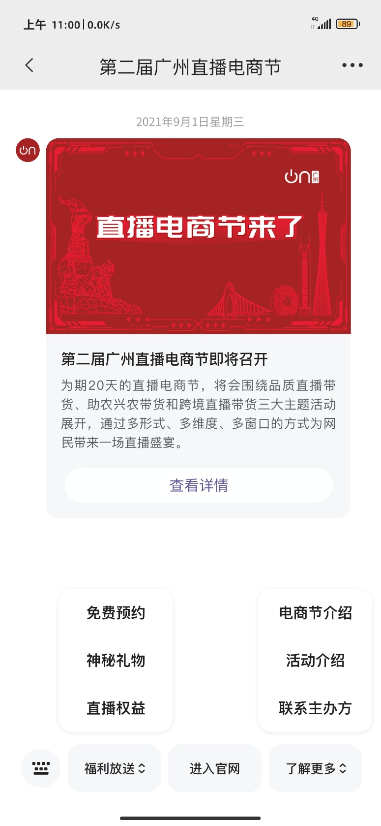 不同于首届直播节仅采取彩信等传统信息推送,第二届广州直播电商节将在5G消息场景化应用方面做了全新生态布局,为广大市民带来全新体验。市内5G手机用户无需下载APP或登录直播平台,通过一条富媒体短信,就可全面了解本次活动亮点,并可一键直达在线预约、领取权益、打开直播间、购买商品、参与互动等活动版块,实现与本次活动零距离的接触,全面提升交互体验。