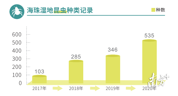 海珠湿地昆虫种类记录情况分别为2017年103种、2018年285种、2019年346种、2020年535种。