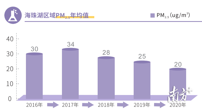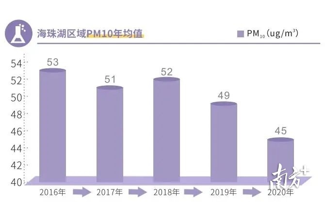 以海珠湖为例,近年来,海珠湿地区域内PM10、PM2.5、CO历年年均值总体呈现稳定下降趋势。
