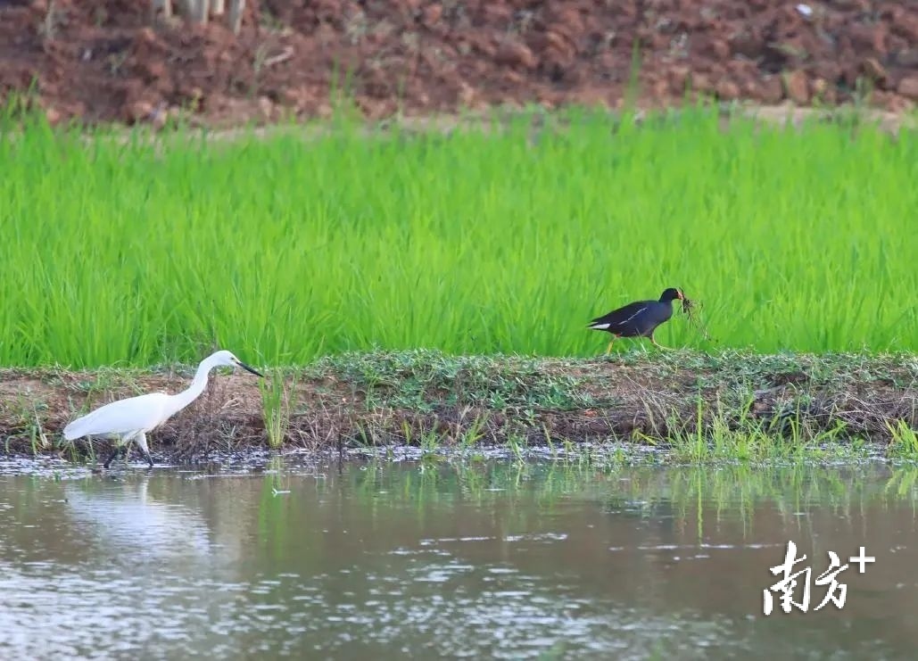 正在生态水稻田里觅食的黑水鸡和小白鹭