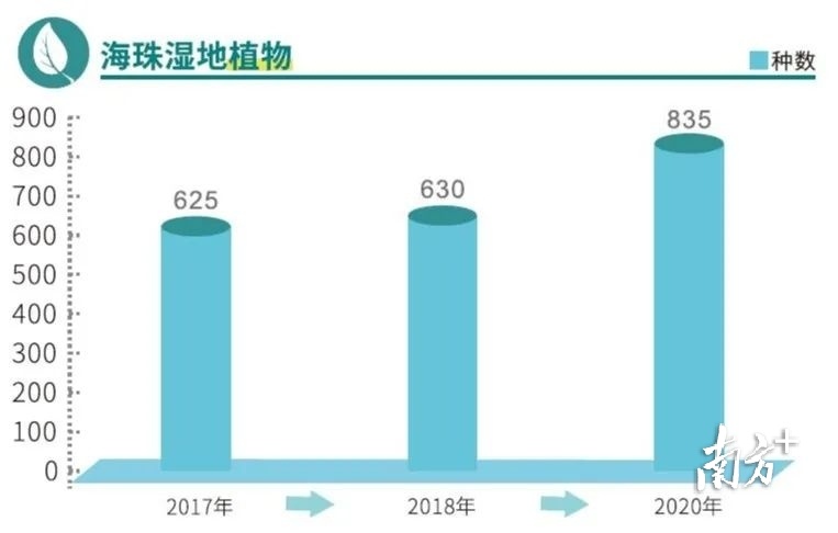 “十三五”期间,海珠湿地维管束植物记录有835种(2017年记录625种、2018年630种、2020年835种)。