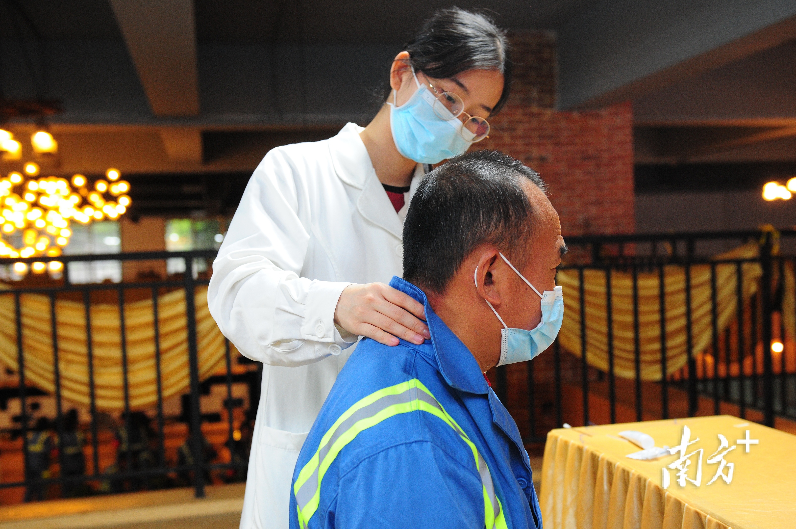 颁奖活动结束后,工会还在海珠环卫工人之家为环卫工们准备了茶歇、互动小游戏、义剪、针灸理疗、心理减压等五大项目。其中,最受欢迎的是义诊活动,记者在现场看到,环卫工刘大哥正在做关节针灸理疗。刘大哥告诉记者,平时工作主要是清洁路面,弯腰捡地上的垃圾,时间长了,肩膀和关节总会不舒服,趁着有义诊,做一下理疗。“(针灸后)感觉舒服多了,十分实用!”刘大哥笑着说。而在茶歇处,叶大哥和妻子正喝着咖啡吃着点心。“点心种类很多,每个都要试一下!”叶大哥边说又拿起了一块蛋糕。据了解,海珠环卫工人之家是由旧厂房改造,共有3层40间房,内有公共厕所、公共浴室、棋牌室和读书角。目前住了近80名环卫工。2018年10月投入运营,至今已有3年时间。下一步,海珠区环卫工人之家将创建广州市首家环卫工会职工服务站。