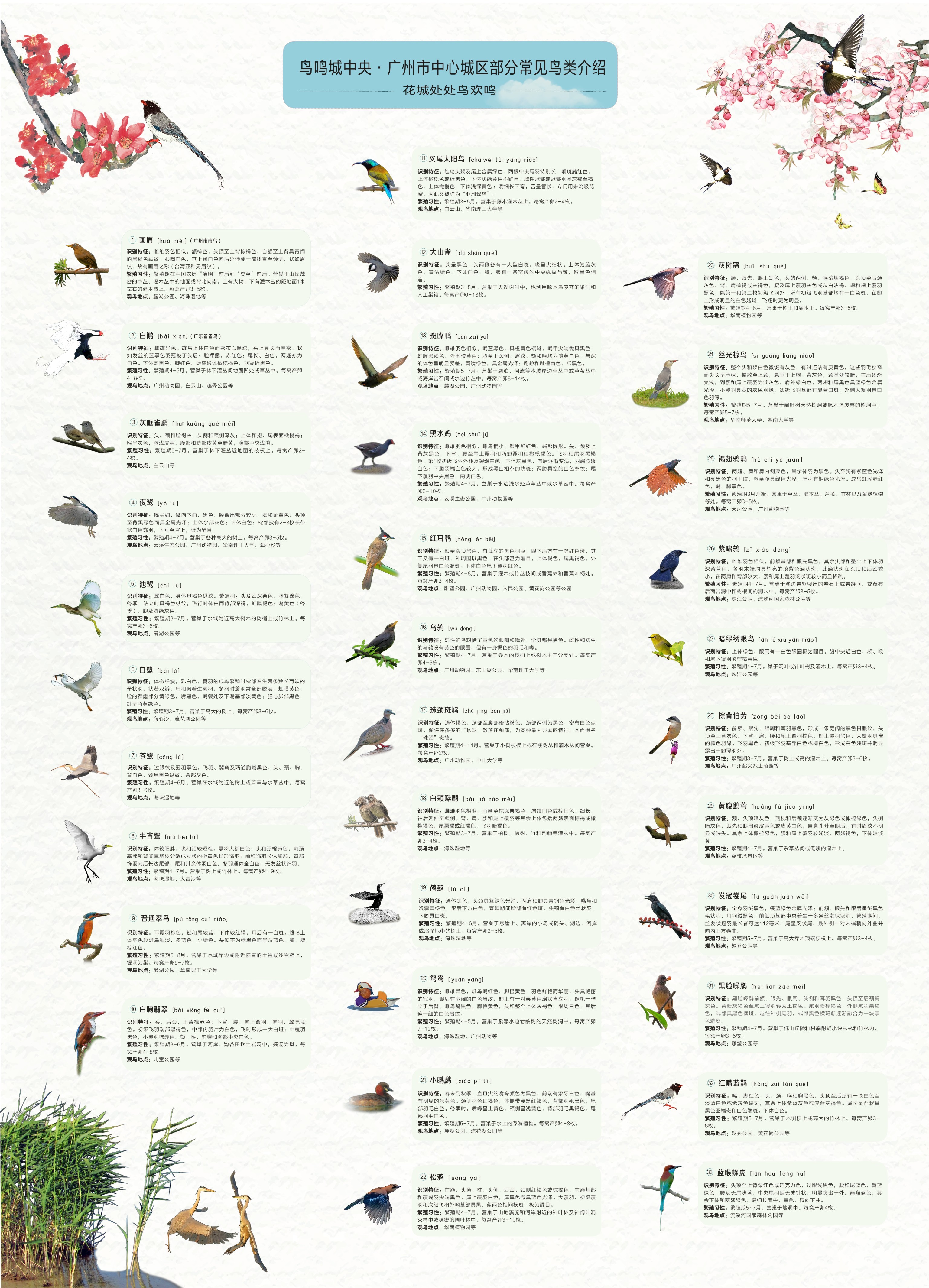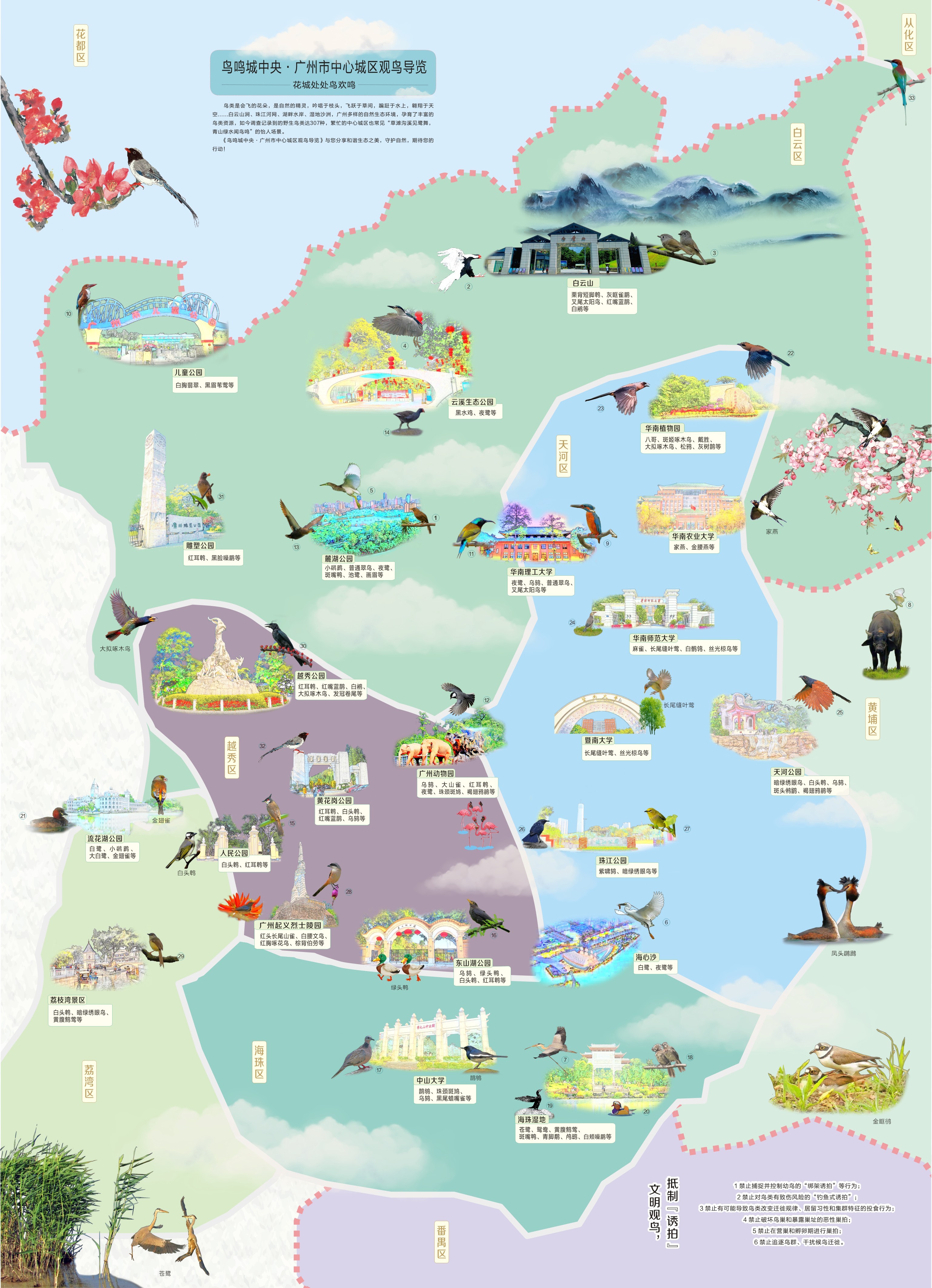 该导览一是以手绘地图形式,展示广州市中心城区野生鸟类分布现状,介绍白云山、越秀公园、人民公园、荔枝湾景区、华南农业大学、海心沙等23处城市公园、景区、大学校园观鸟点的野生鸟类分布情况。