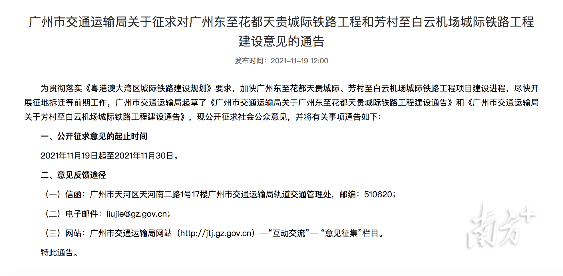 11月19日,广州市交通运输局发布了关于征求对广州东至花都天贵城际铁路工程和芳村至白云机场城际铁路工程建设意见的通告,就这两条城际的建设公开征求社会公众意见,以期尽快开展征地拆迁等前期工作。
