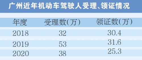 2020年由于受疫情影响,广州6月份才全面放开驾考业务,但全市受理申领驾驶证仍达38万宗。
