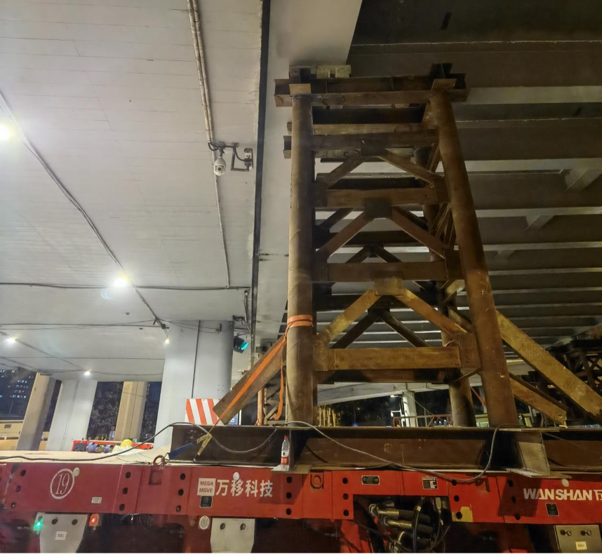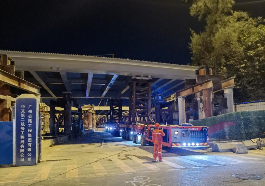 12月1日晚,在广州交投鹤洞大桥大中修工程H线引桥跨工业大道段施工现场,四台SPMT模块车齐驱并进,一块长38.5米、宽22米、距地面6.5米、重达500吨的H31#整跨组合梁缓缓向前推进。