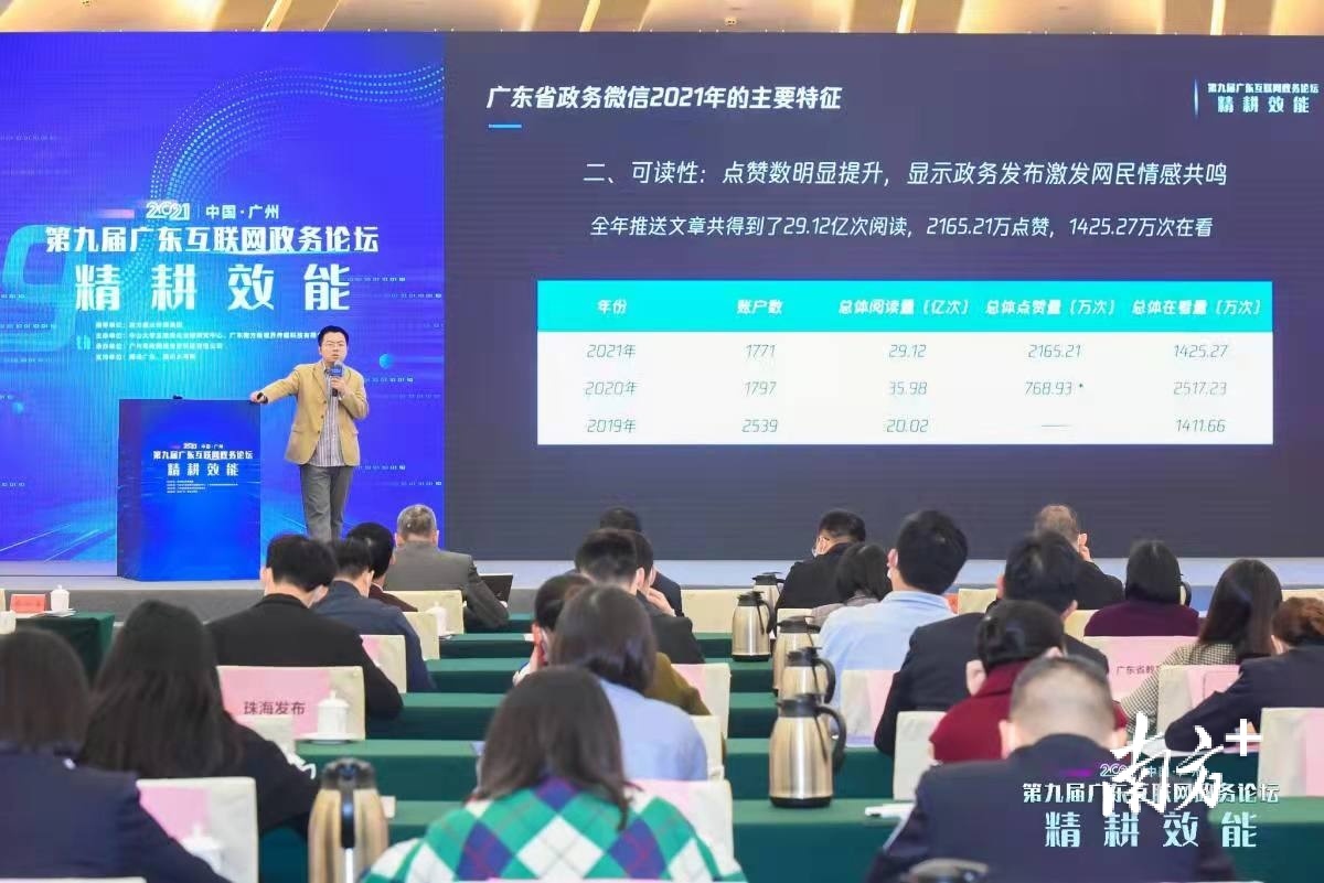 2021年12月24日下午,第九届广东互联网政务论坛在广州举办。本届论坛以“精耕效能”为主题,聚焦政务新媒体的内容生产、运营传播、技术创新,邀请全省优秀政务新媒体管理者和运营者,共同探讨广东政务新媒体的创新传播趋势与经验。同时,论坛发布了2021政务新媒体指数报告,并对民生服务与内容创新等优秀经验进行分享。