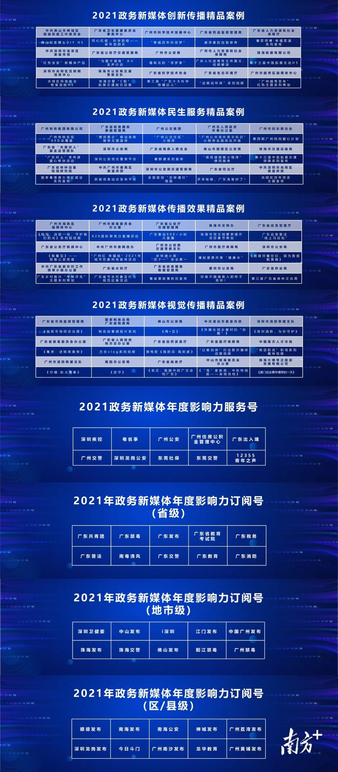 根据报告中的政务微信影响力排行,专家评选出了2021年政务新媒体年度最佳政务号(省、市、区)和精品案例。其中年度最佳政务分省级、市级、区级,年度最佳政务号四大类,共计40个;精品案例分为创新传播、民生服务、传播效果、视觉传播四大类,共计60个。