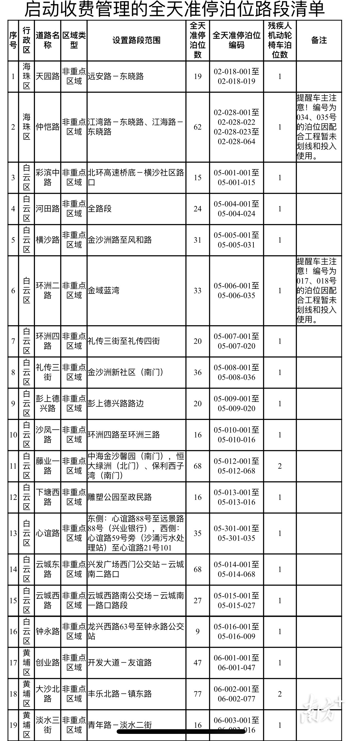 为规范管理广州市中心六区城市道路临时泊位,提高临时泊位周转率,为更多市民提供便捷的停车服务,广州市交通运输部门计划自2022年1月1日起,对海珠区天园路、白云区彩滨中路、黄埔区创业路等26条城市道路临时泊位停放的车辆,按照《广州市中心六区城市道路临时泊位使用费标准》启动收费管理,相关日常管理工作由广州市道路事务中心具体实施。
