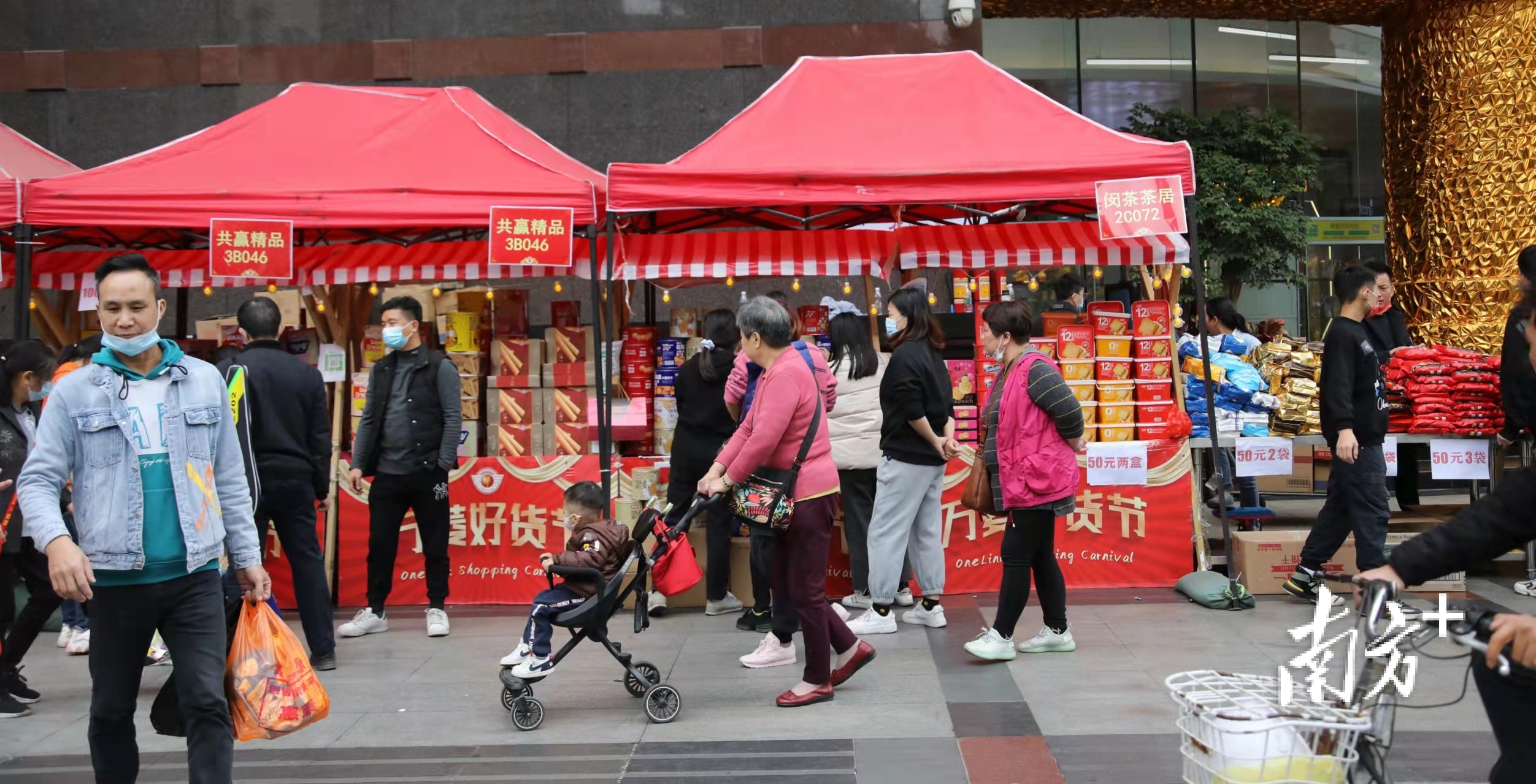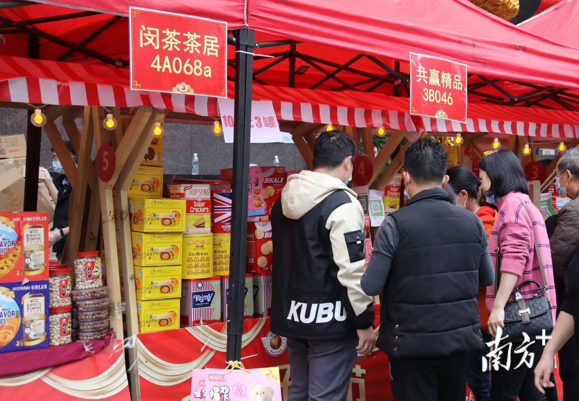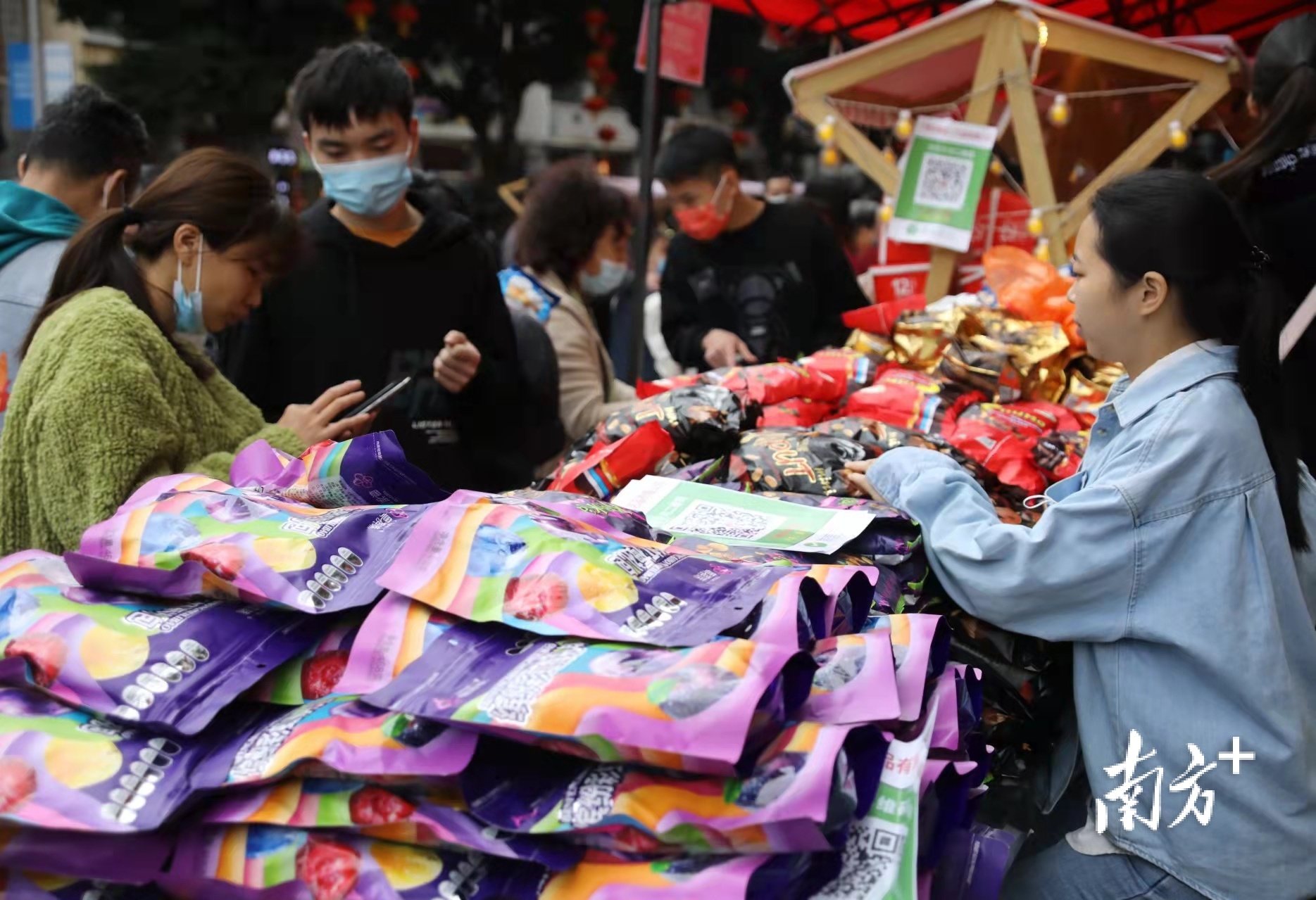 在一德路年宵集市,干果、海鲜、零食、糖果的摊档开张,商贩笑意盈盈,置办年货的市民穿梭其间,手中提袋鼓鼓囊囊,交谈中掩不住过年喜气。