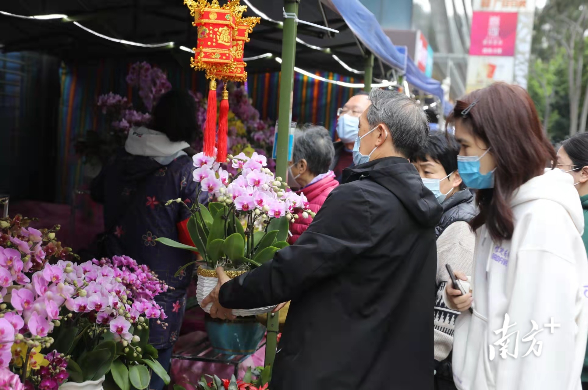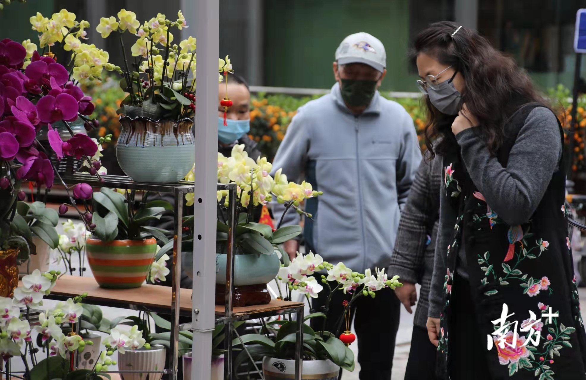 在广州越秀区农林下路临时花街,蝴蝶兰、金桔、发财果……有着美好寓意的花卉纷纷上架。市民驻足其间。