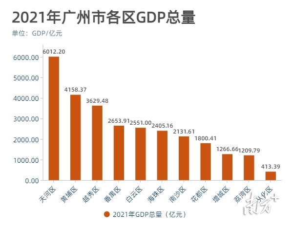 纵观“十三五”以来的经济数据,广州经济前三区的地位相对稳定。以2021年底的数据来看,天河、黄埔、越秀分别跨入6000亿元、4000亿元、3000亿元大关,且与身后的其他区保持着1000亿元左右的差距。它们可被视为广州的“头部梯队”。
