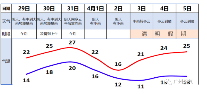 据@广州天气,本周雷雨持续,预计明后两天(29日—30日),雨势再度加大,并可能伴有雷电大风等强对流天气,气温也逐日回升。