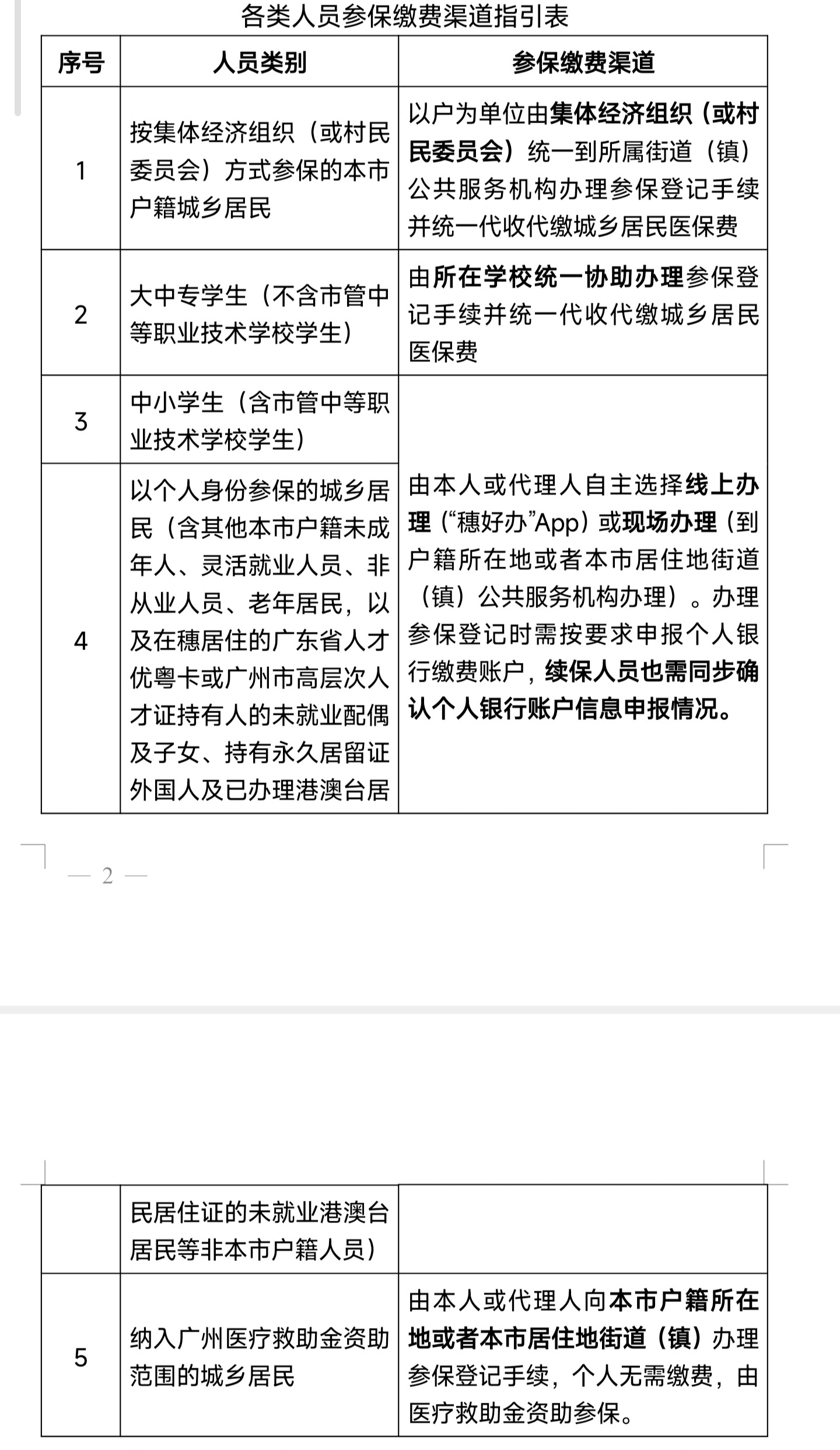 据悉,本次参保缴费范围包括:一是广州行政区域内的各类高等学校、中等职业技术学校、技工学校及科研院所等院校、中小学校的全日制在校学生;二是具有广州户籍且未参加职工社会医疗保险(以下简称职工医保)的城乡居民,包括未成年人(未满18周岁的非在校学生)、灵活就业人员、非从业人员以及老年居民;三是在穗居住的广东省人才优粤卡或广州市高层次人才证持有人的未就业配偶及子女、持有永久居留证外国人及已办理港澳台居民居住证的未就业港澳台居民(以下简称其他非本市户籍人员)。