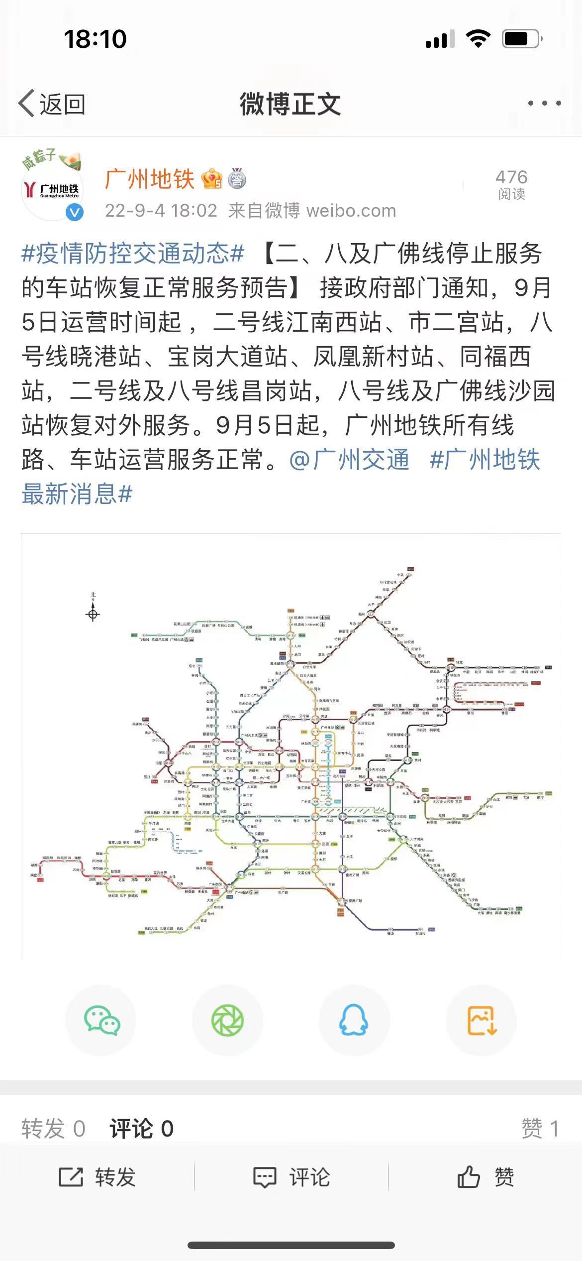 广州地铁方面,自2022年9月5日运营时间起,对地铁二号线江南西站、市二宫站,八号线晓港站、宝岗大道站、凤凰新村站、同福西站,二号线及八号线昌岗站,八号线及广佛线沙园站,恢复所有出入口对外运营服务。9月5日起,广州地铁所有线路、车站运营服务正常。