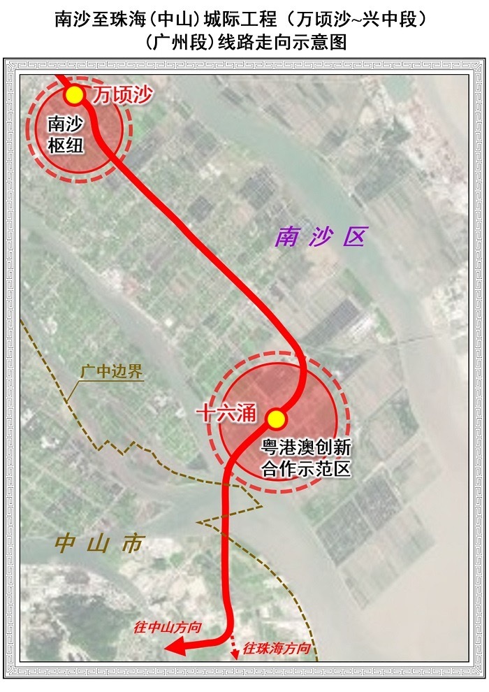 (三) 工程建设内容:项目广州段线路自南沙万顷沙站至十六涌站,往南衔接中山、珠海,广州段新建线路长度约15公里,与既有广州市轨道交通十八号线贯通运营。