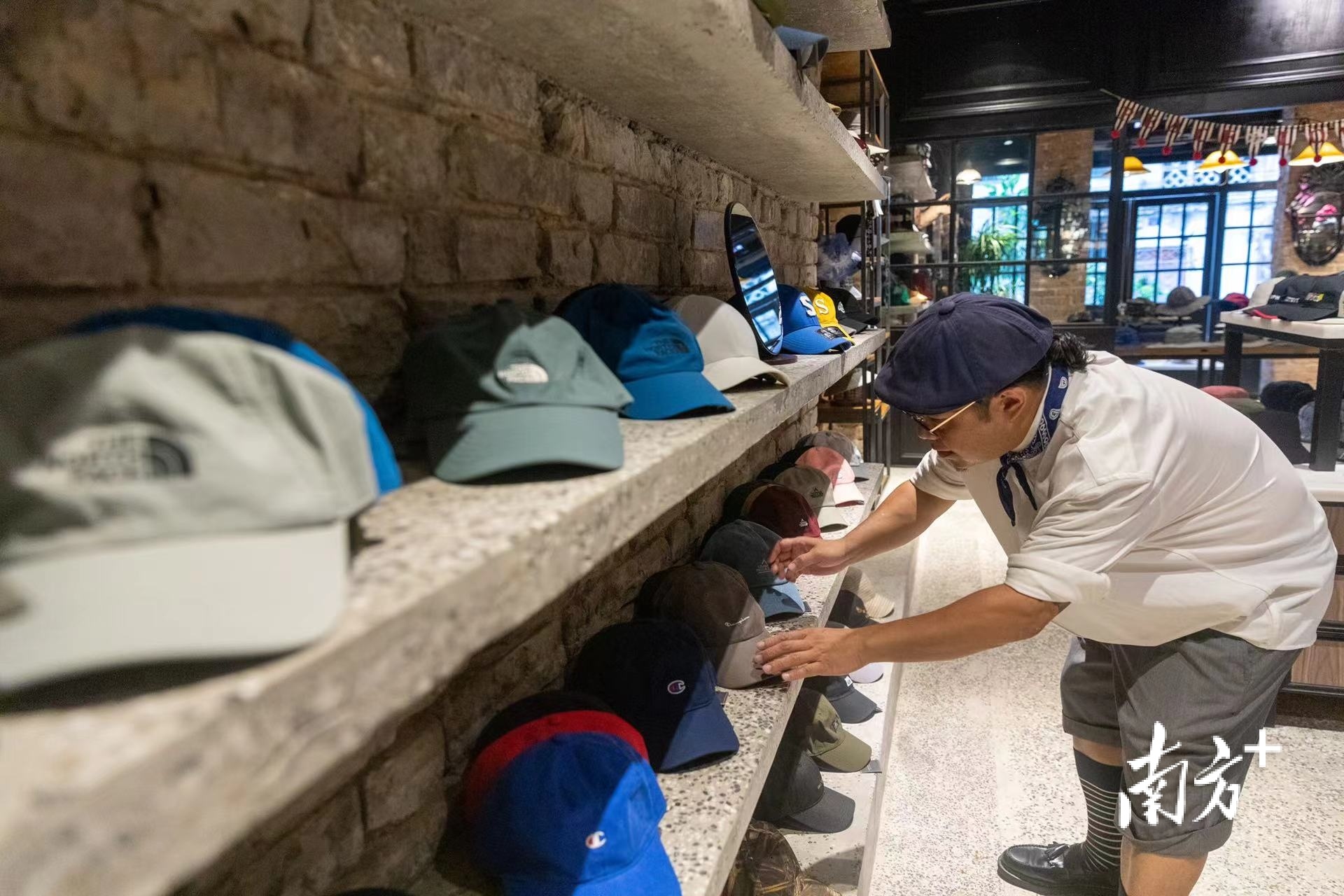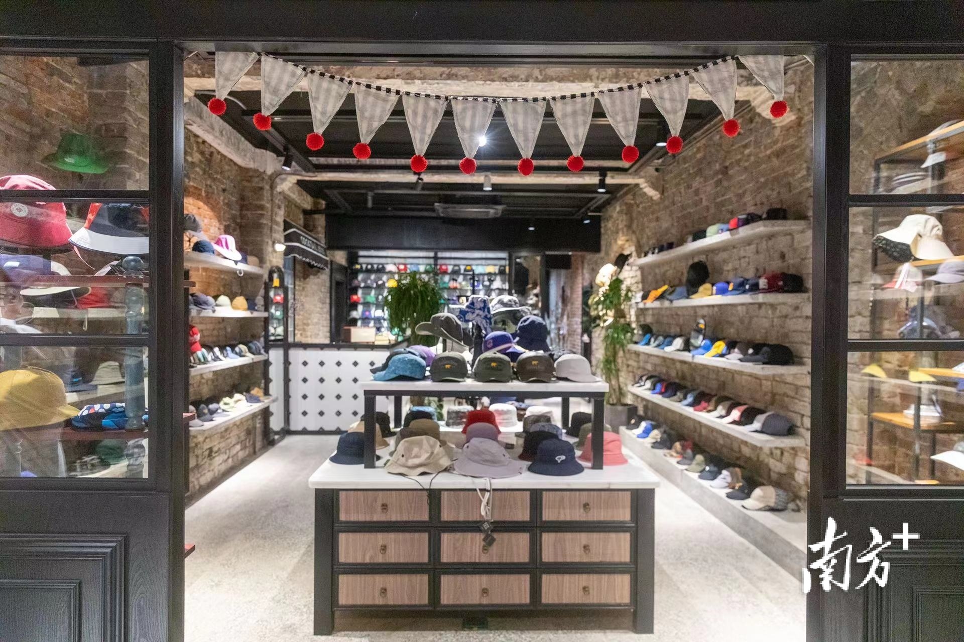 盘下了首店,杨伟雄并没有停下。如今,他将店铺搬到庙前西街,两间相邻的店铺一家专做帽子,另一家则混合了各类服饰。帽子店里保留了老楼原本的墙砖和拱形的墙面结构,也将东山口的旧时光一同保留下来,与新潮的帽子搭配在一起,游客在一间店铺内就能体验“旧”与“新”的交织。