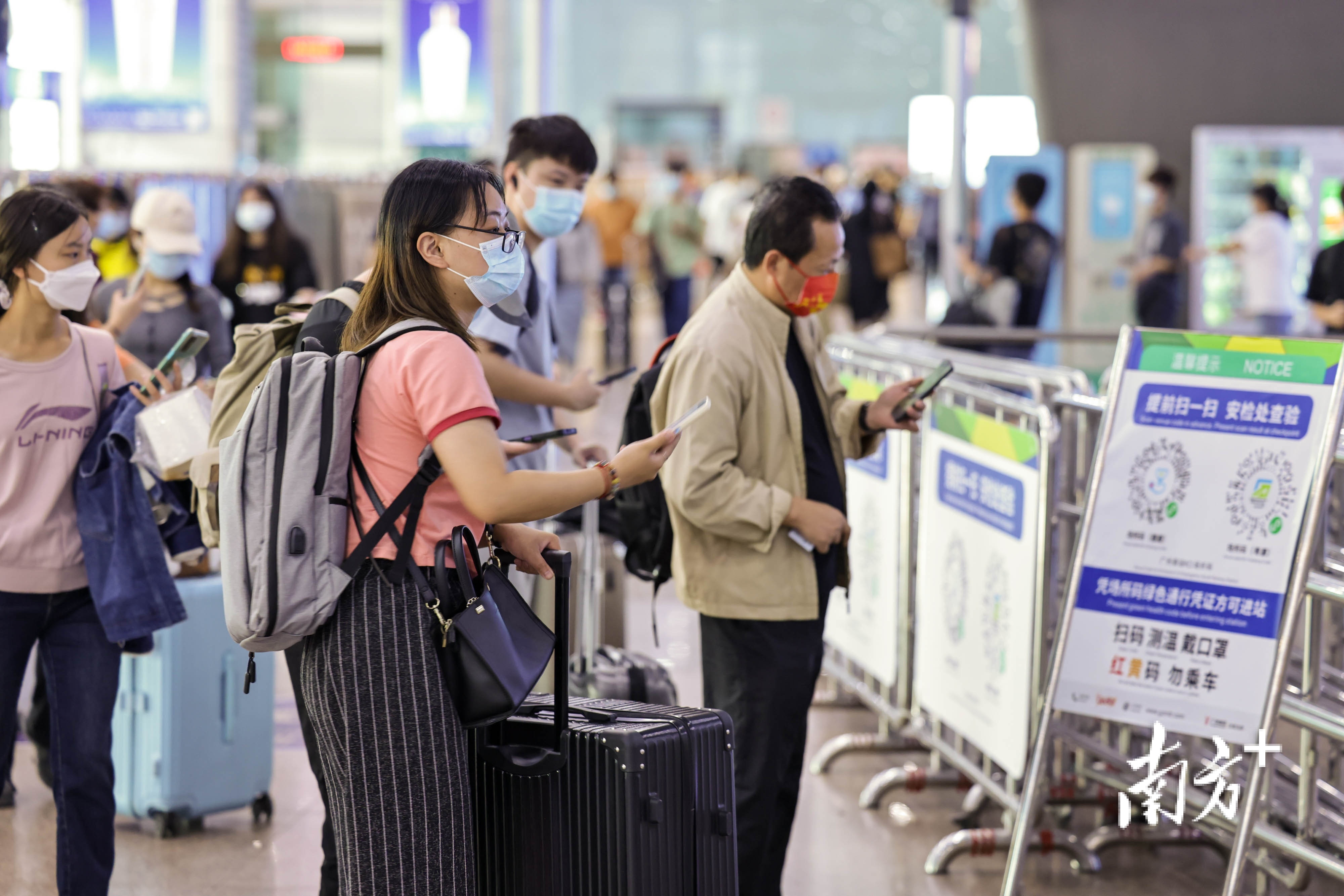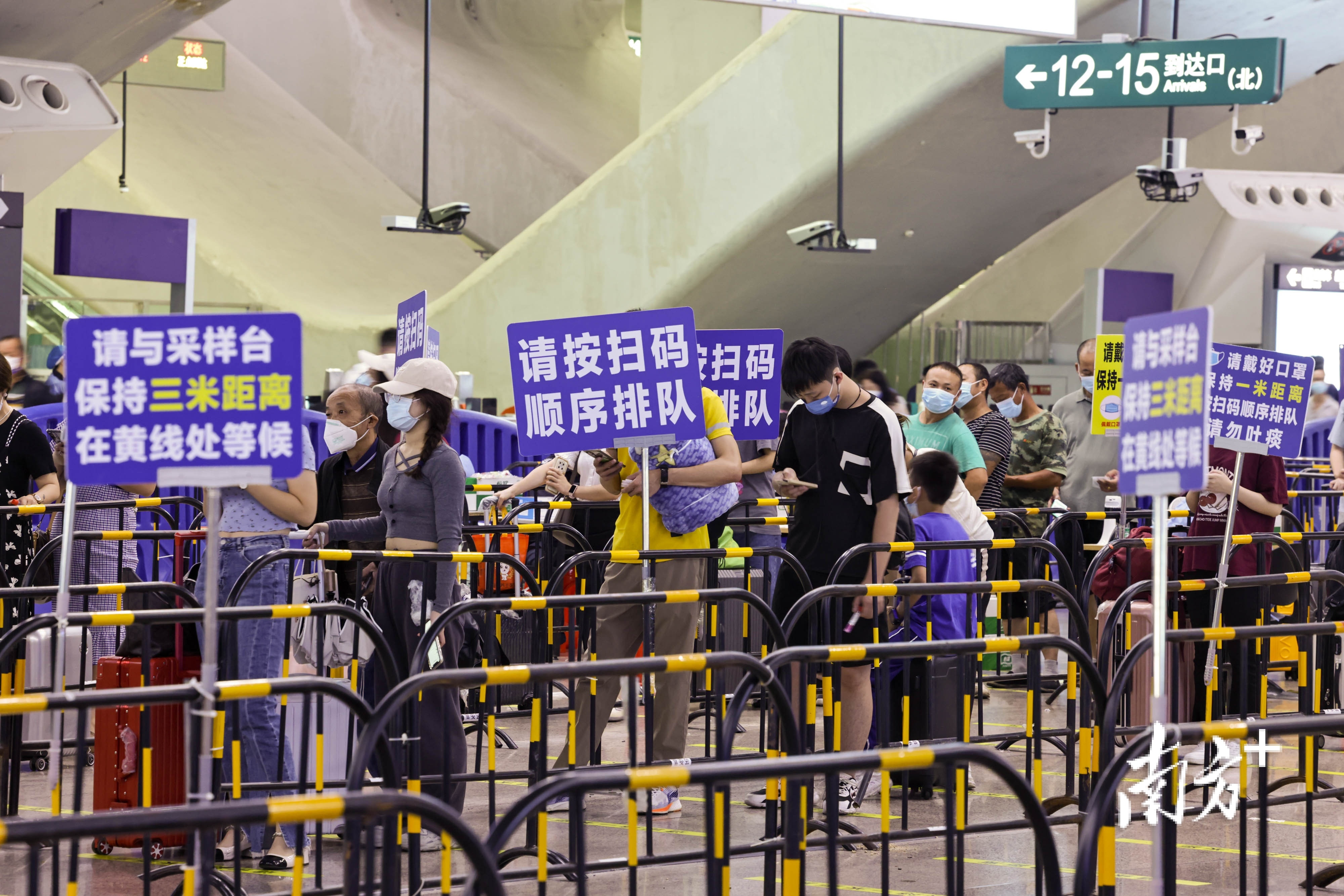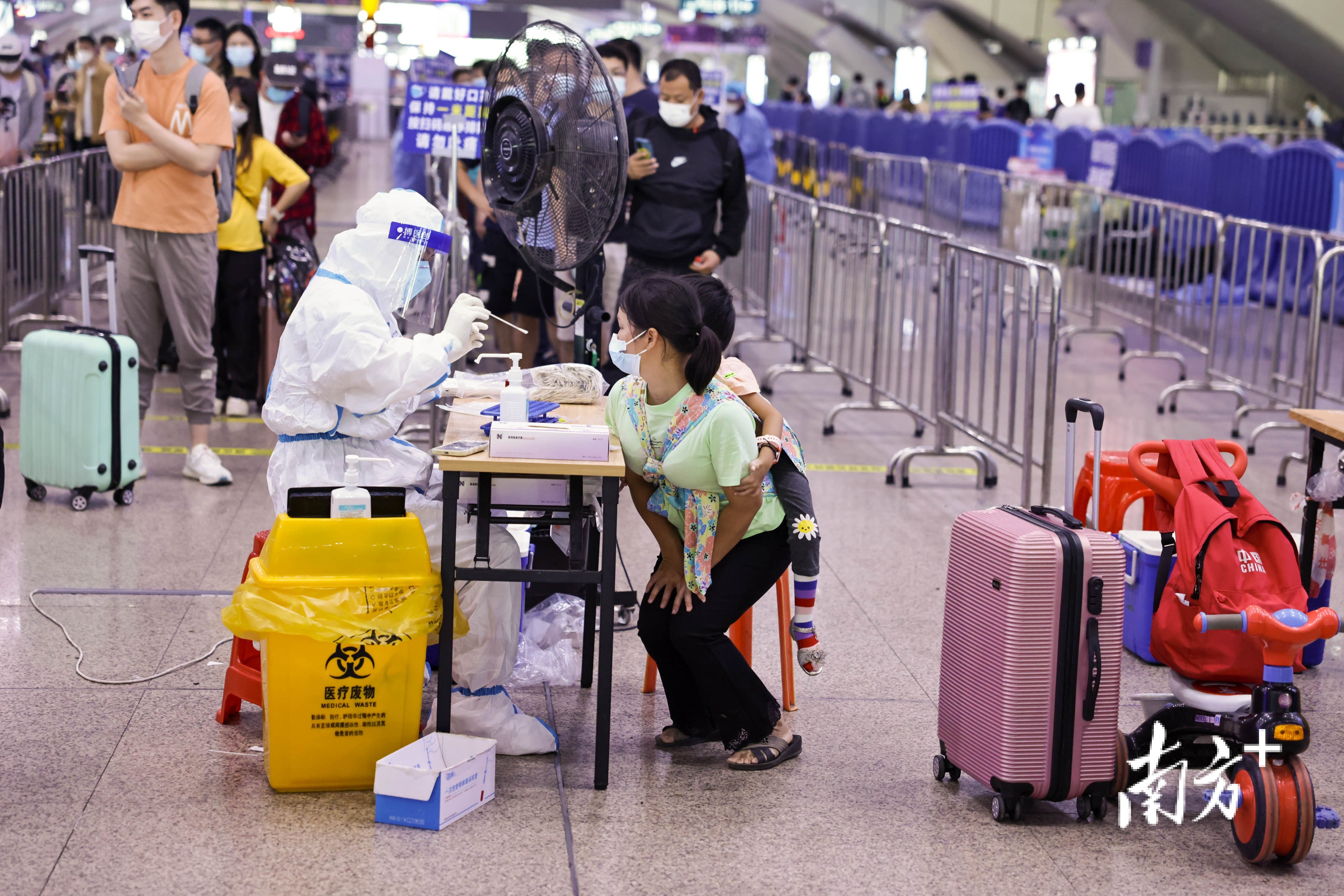 继续做好“两站一场一服务区”来穗人员的“落地检”,国庆期间,共设置67个核酸检测采样点、155个采样通道,保障乘客检测需要。