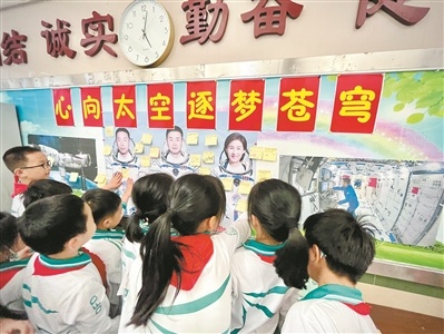 “空间站由哪些部分组成,空间站是如何进入轨道的?”“太空中的水稻与地球上的水稻有什么不同?”“航天员在太空中是如何刷牙的?”“在空间站中流眼泪会如何呢?”据悉,东风东路小学依托“天宫课堂”,抓住教育契机,给同学们布置了“小导师”任务,同学们提前检索了航天科技相关知识,并在课堂上互相解答疑问。当老师向同学们提出相关问题时,同学们纷纷举手回答。老师还给每位同学派发了便利帖,同学们写下自己对航天科学的疑问和对航天员的祝福,贴在了教室后面的墙上。