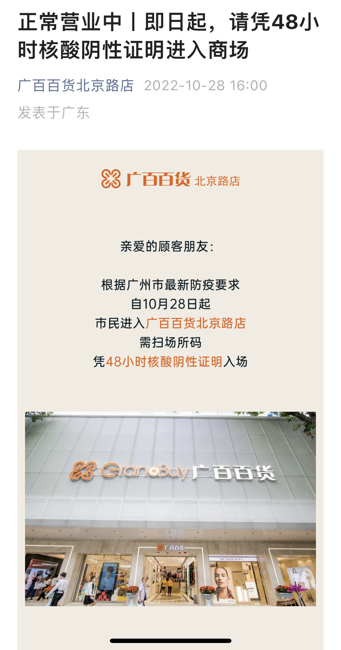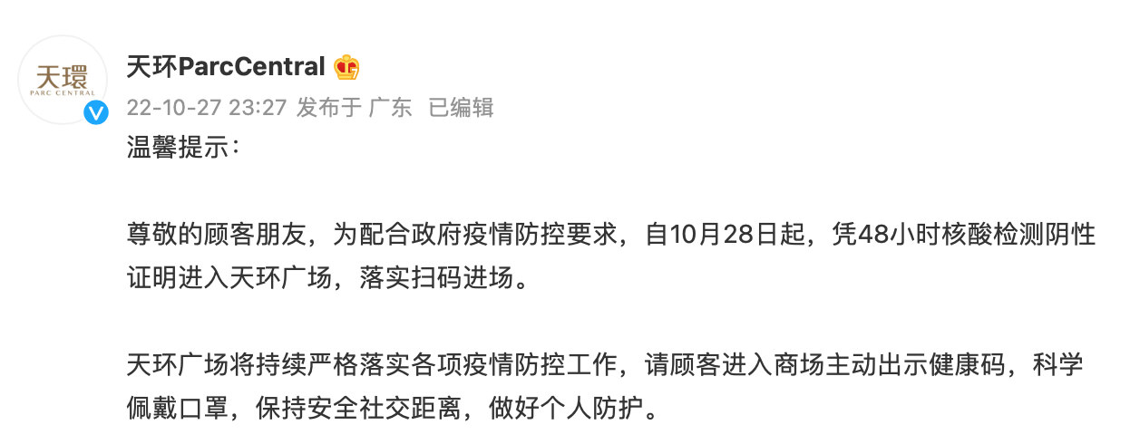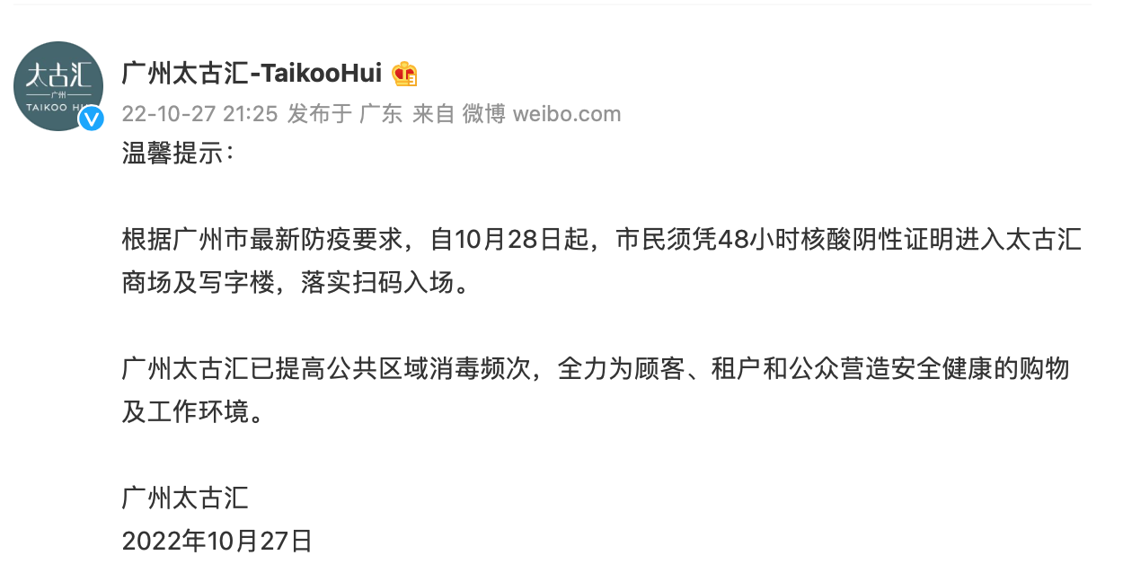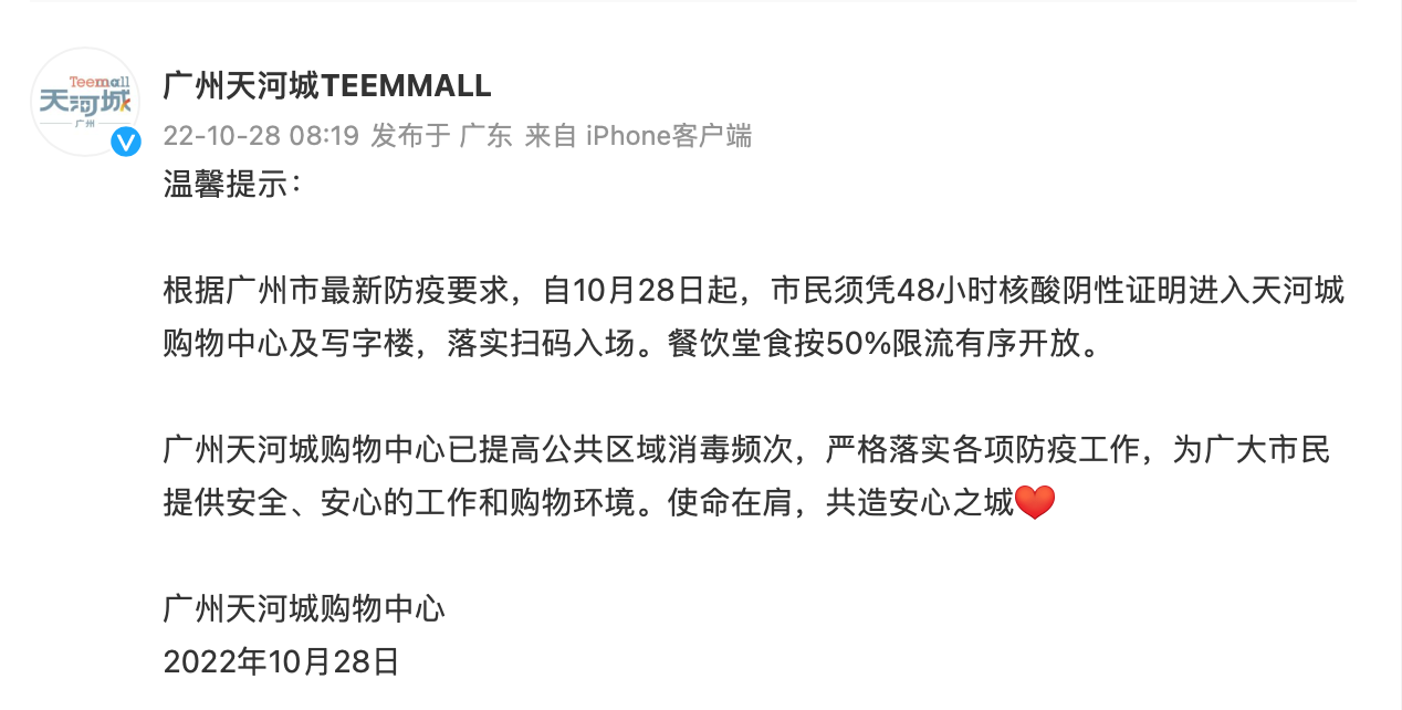 10月27日晚至10月28日,广州多家商场陆续向广大市民发布通告,自10月28日起,市民须凭48小时核酸阴性证明进入,落实扫码入场。当前,全市各商贸载体严格执行疫情防控最新要求,共同携手筑起疫情防控“安全线”。