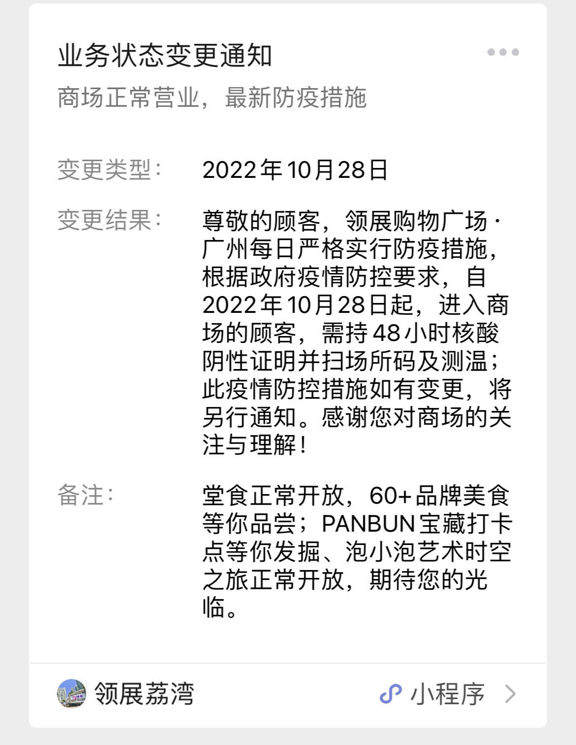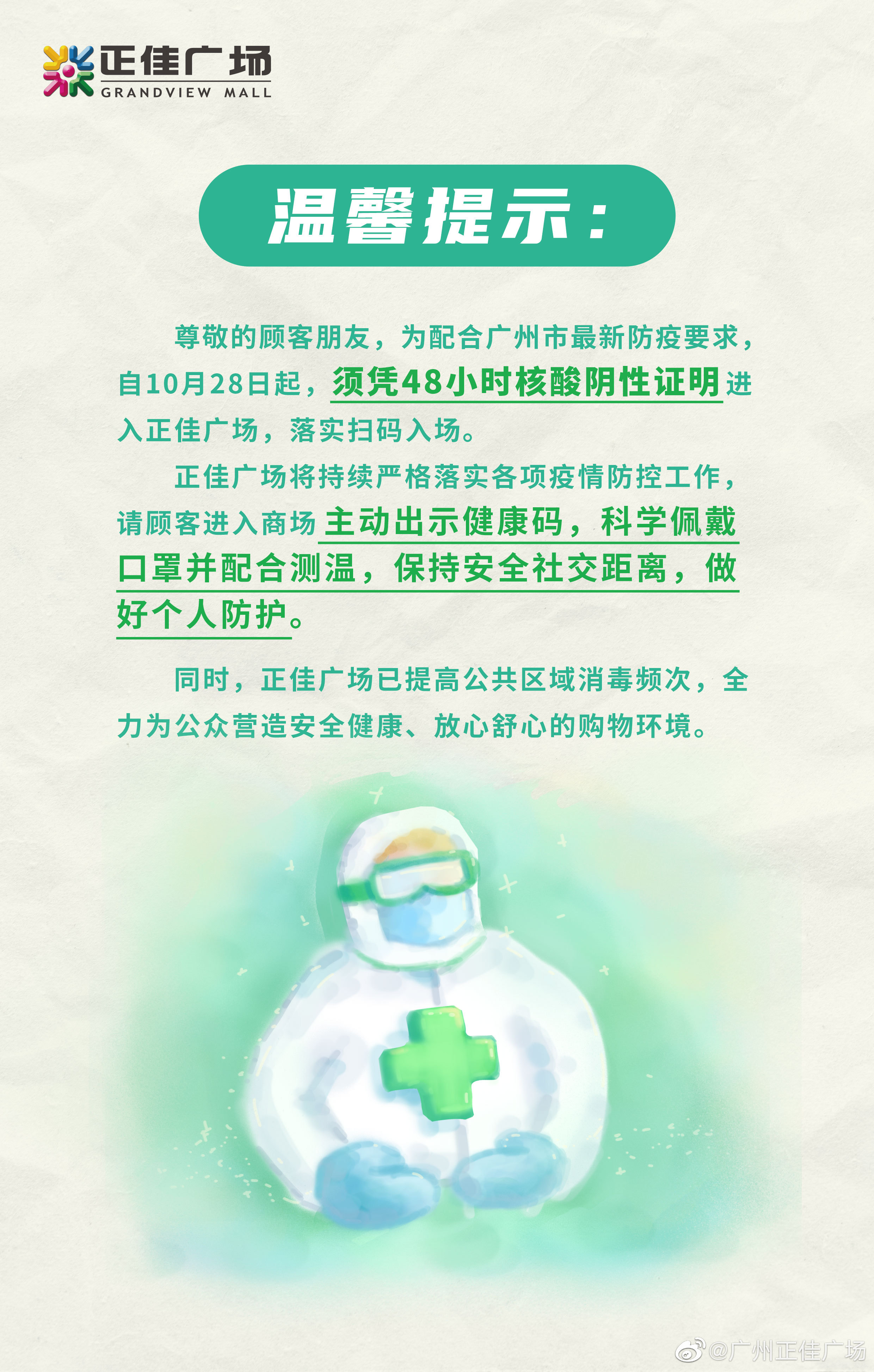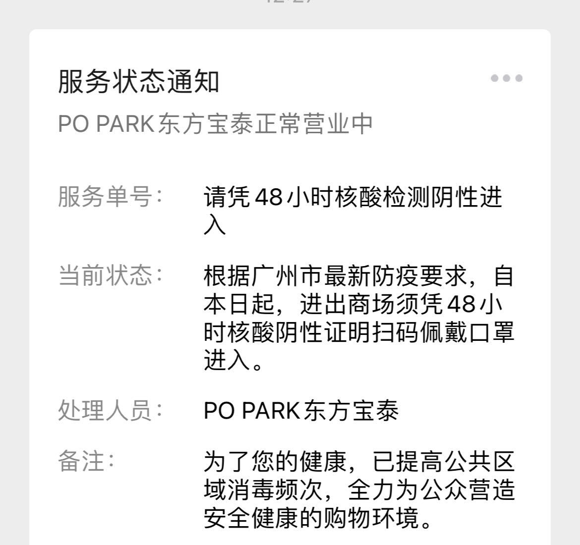 10月27日晚至10月28日,广州多家商场陆续向广大市民发布通告,自10月28日起,市民须凭48小时核酸阴性证明进入,落实扫码入场。当前,全市各商贸载体严格执行疫情防控最新要求,共同携手筑起疫情防控“安全线”。