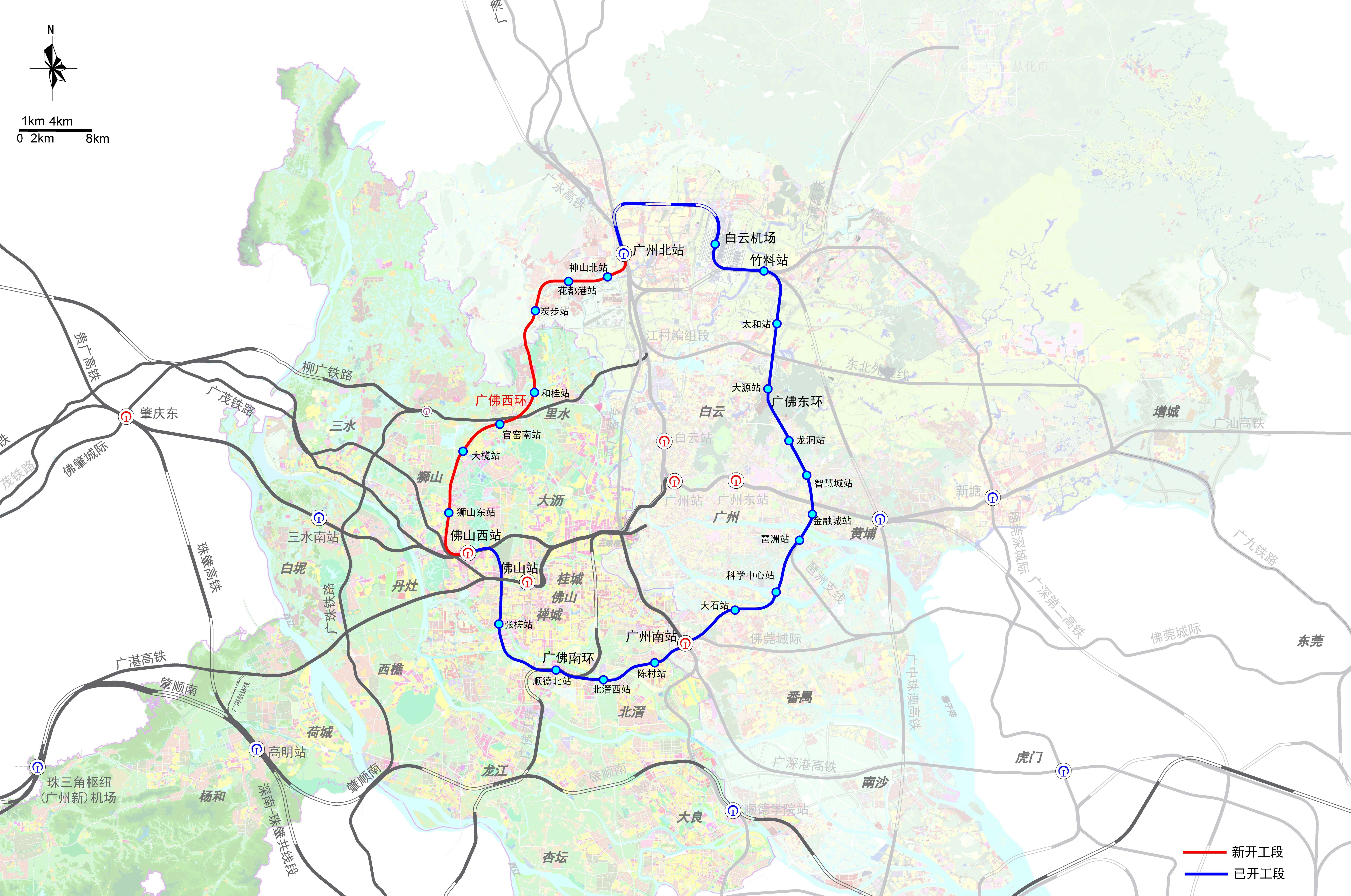 目前广佛环线中,北段(白云机场北站至广州北站)已于2020年11月通车;南段(佛山西站至广州南站)正在进行静态调试;东段(广州南站至白云机场北站)预计在今年底建成;西段(佛山西站至广州北站)已开工建设。